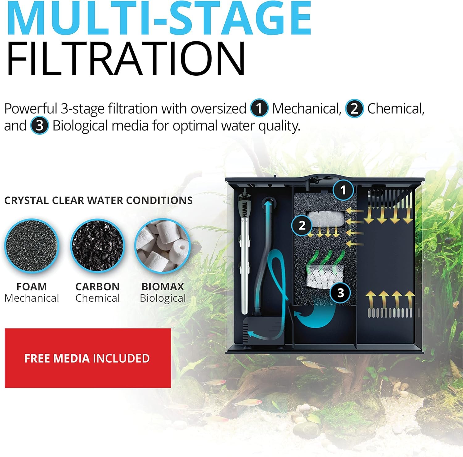 • Powerful 3-stage filtration with oversized mechanical, chemical, and biological media for superior water quality