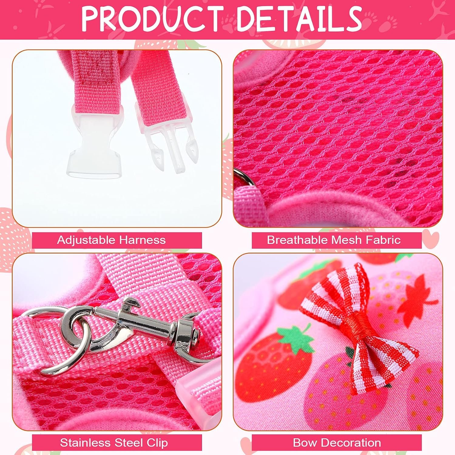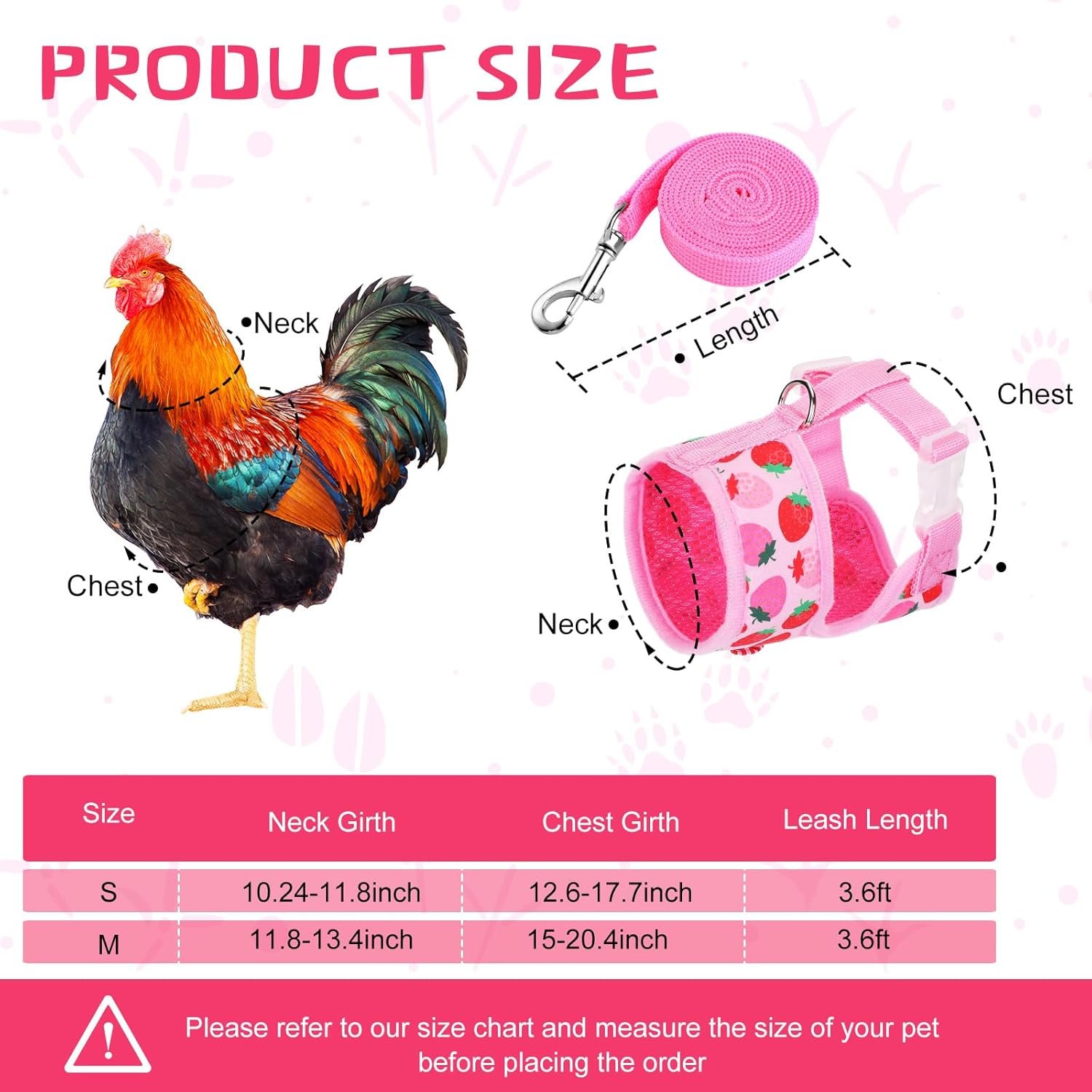 The package includes 2 pieces of elastic small pet harness with leash. The harness is available in two sizes: S and M. The S size has a chest girth of approximately 12.6-17.7 inches and a neck girth of approximately 10.24-11.8 inches. The M size has a chest girth of approximately 15-20.4 inches and a neck girth of approximately 11.8-13.4 inches. Please measure your pet’s size before ordering.