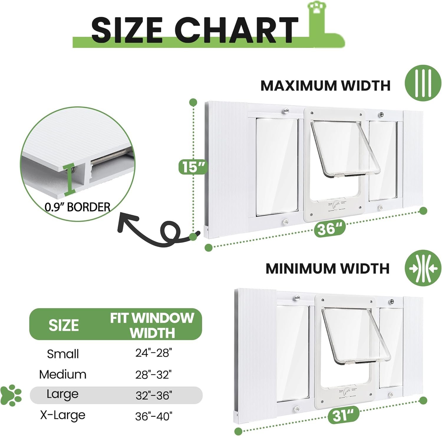 Before purchasing, please ensure to measure the window width according to the provided method. The product is suitable for sash windows with a width of 32″-36″. The flap size is 7.8″W x 10.6″H, and the door frame height is 15″ with a thickness of 0.9″.