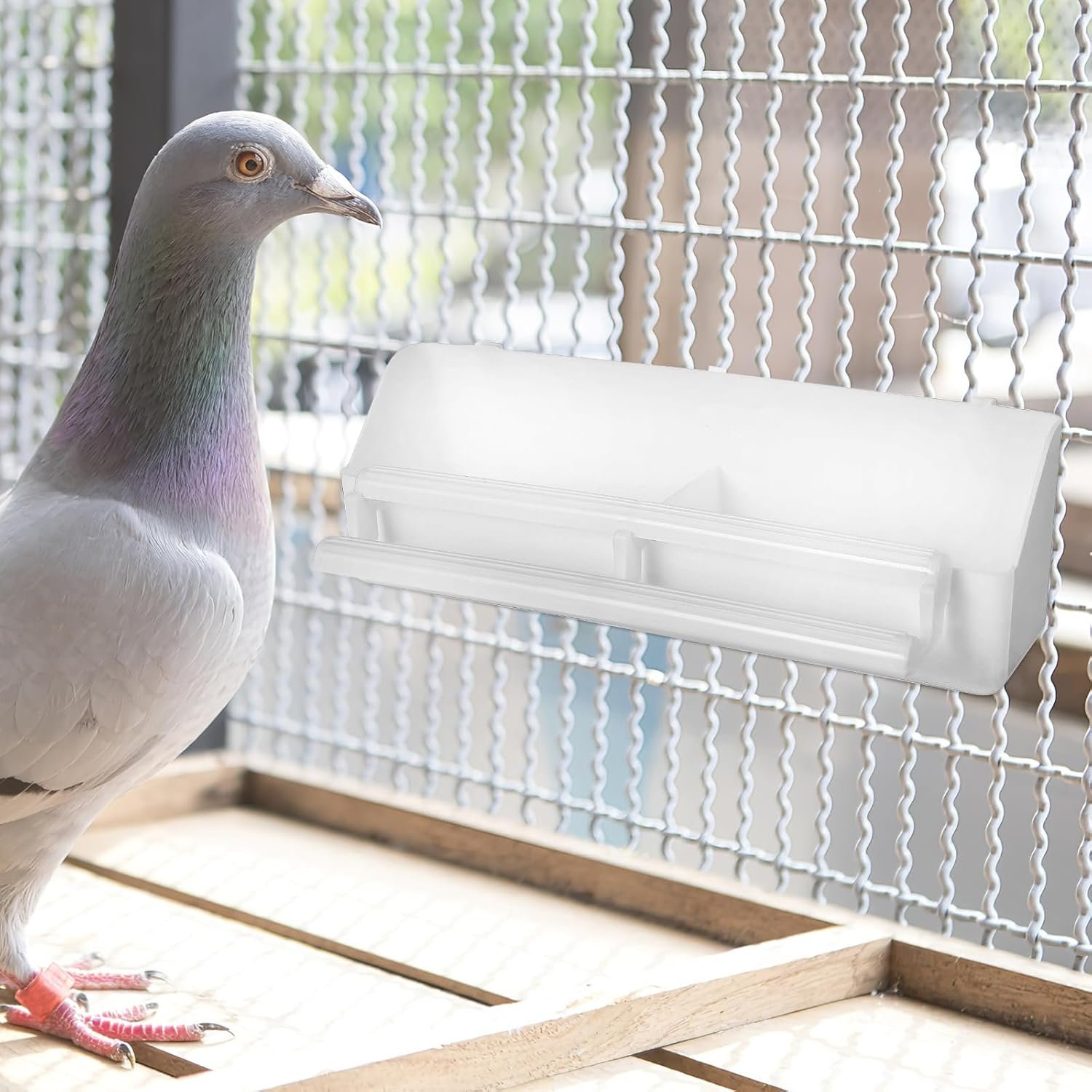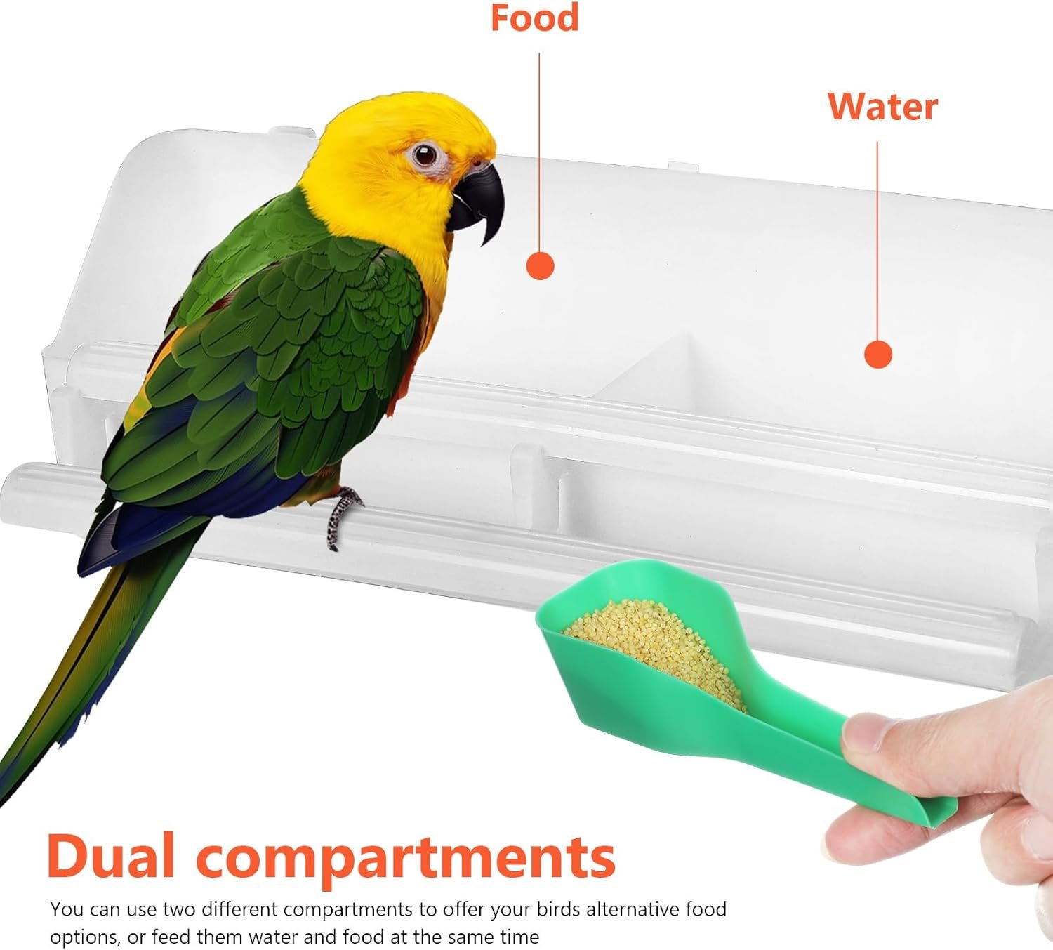 These plastic feed dishes are ok for parakeets and smaller birds. A large bird could just bite them and break a piece off. One of ours arrived cracked and with a couple pieces broken off. They are not very sturdy, but they are sturdy enough for parakeets or finches. Also, they have fairly small hooks to hold them onto the cage, so again, that is fine for parakeets or smaller birds, but even a small Conure would be able to lift a side off the wire and dump it.They have dividers, but it is not practical at all to put seed in one side and water in the other. The birds will get the seeds in the water immediately. So, it is better to use one of the dishes entirely for seed, and one entirely for water.It is nice that they included a little scoop.