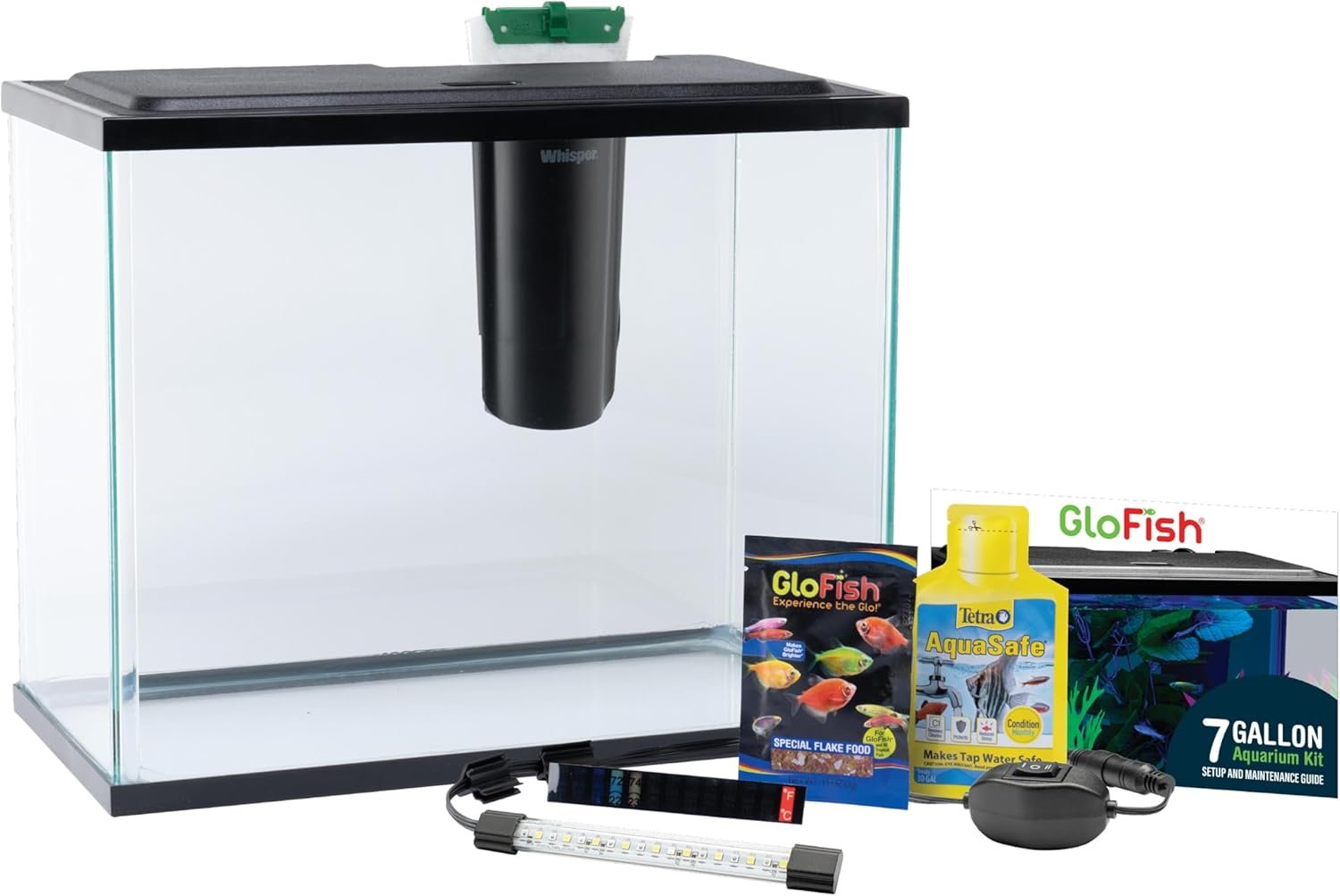 The GloFish 6.6-Gallon Aquarium Kit is a comprehensive starter kit designed to provide a complete underwater fluorescent experience. This kit includes a 6.6-gallon glass aquarium, a plastic hood with feeding access, a blue and white LED lighting system, the Tetra Internal Filtration System, a digital thermometer, a GloFish Special Flake food sample, a Tetra AquaSafe water conditioner sample, and a full-color setup and maintenance guide.
