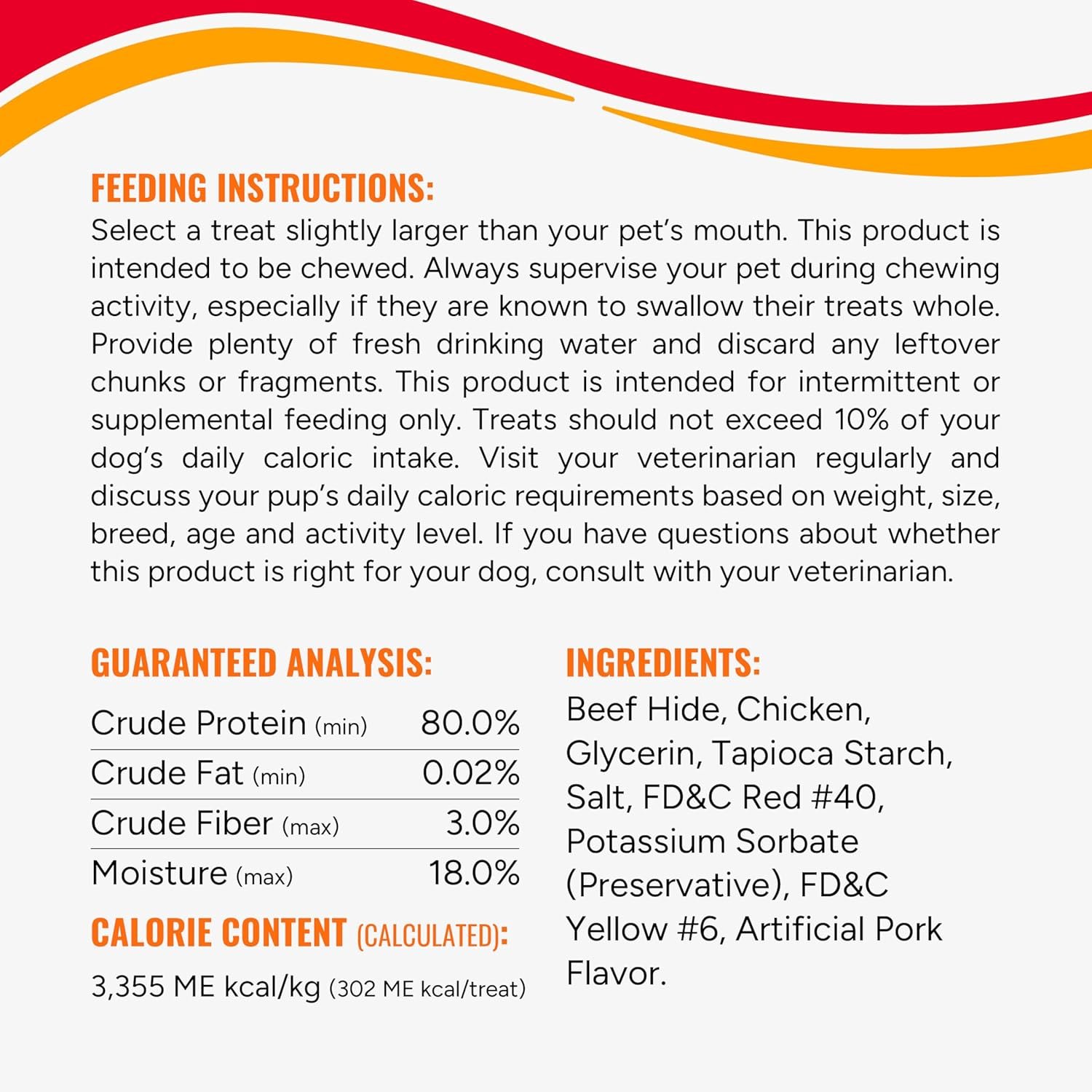 - Combines three delicious treats in one: long-lasting beef hide, artificial pork flavor, and premium chicken