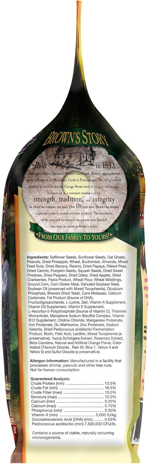 Brown’s Tropical Carnival Gourmet Bird Food for Parrots, African Greys, and Conures Under 13″ is a natural, vitamin-nutrient-fortified daily diet that serves as both a food and treat. This super premium gourmet food is specifically formulated to help Small Hookbills thrive, with a mix of fruits, nuts, vegetables, and wholesome seeds and grains. The inclusion of natural preservatives ensures freshness, while Omega Fatty Acids, antioxidants, and beneficial bacteria support good digestion.