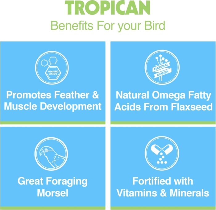 Tropican High Performance food sticks are a premium diet for parrots, providing optimal nutrition for breeding, weaning, and molting birds. These sticks are formulated with essential vitamins and minerals to support the full life cycle of parrots, making them an excellent choice for birds that require extra protein and nutrition.