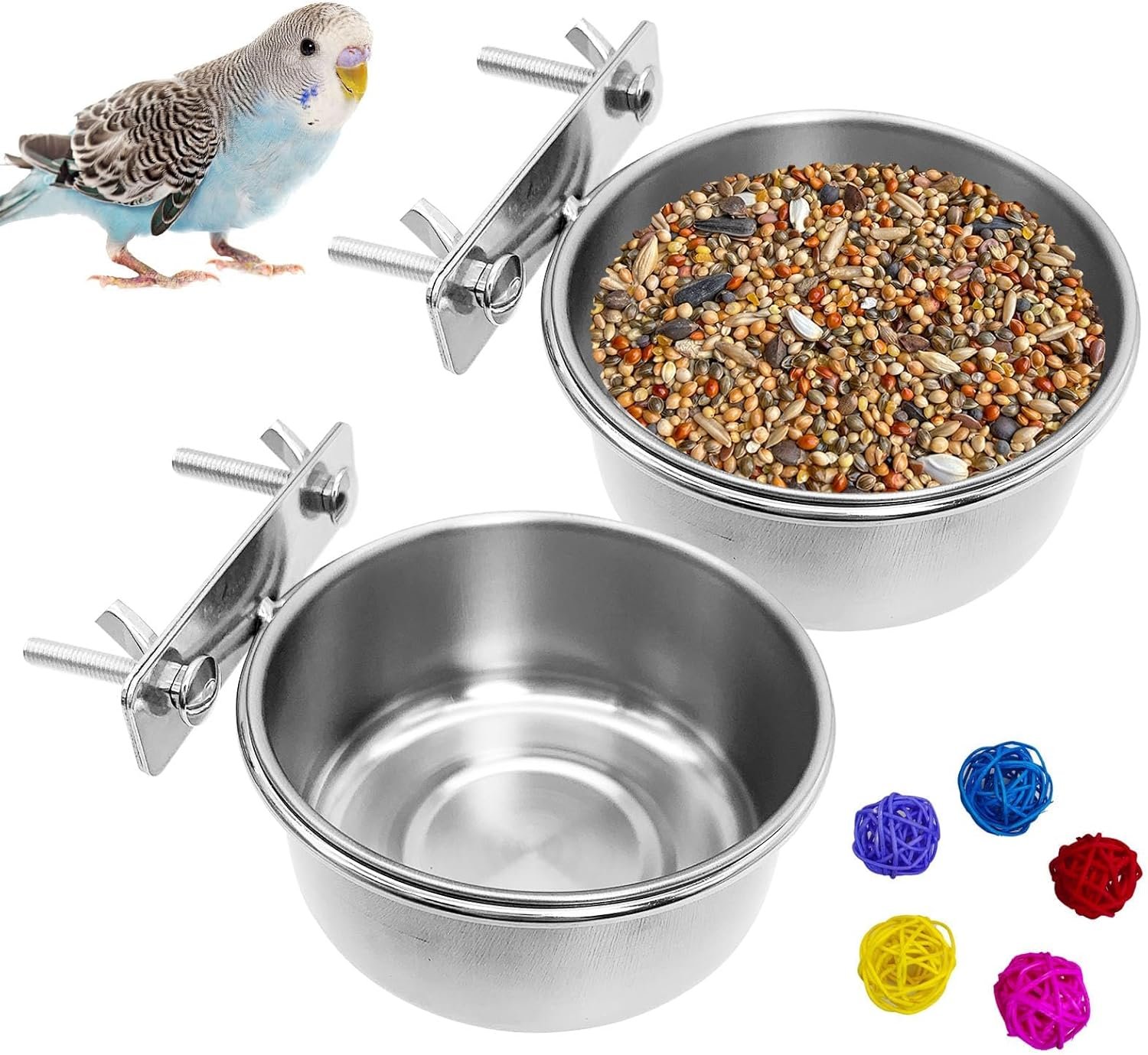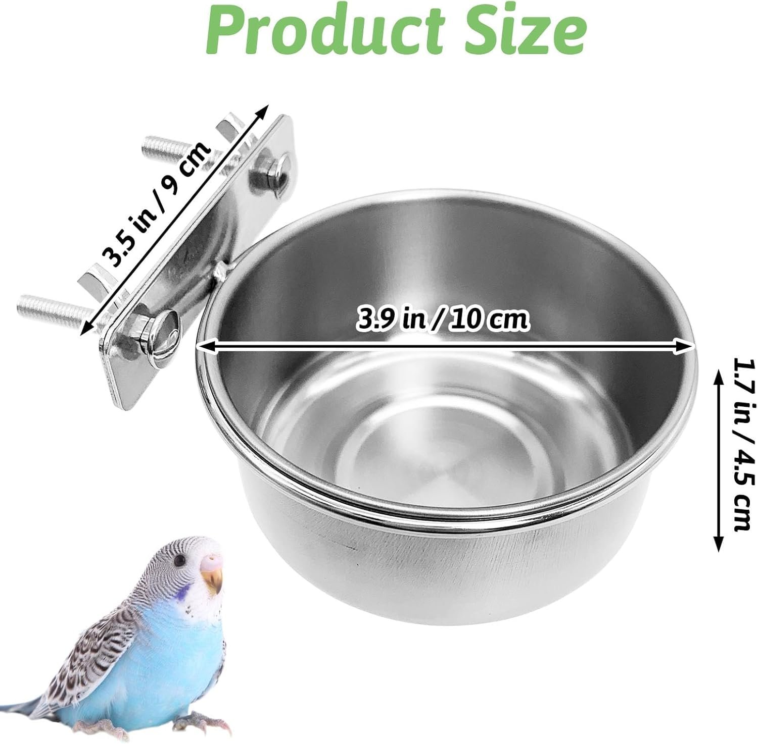 Our 2 Pack Bird Bowl is made of stainless steel and is safety and healthy to use. The bird cage food water holder size is 10 x 4.5 cm/3.9 x 1.7 inches, and the chew toy ball is 3 cm/1.2 inches.
