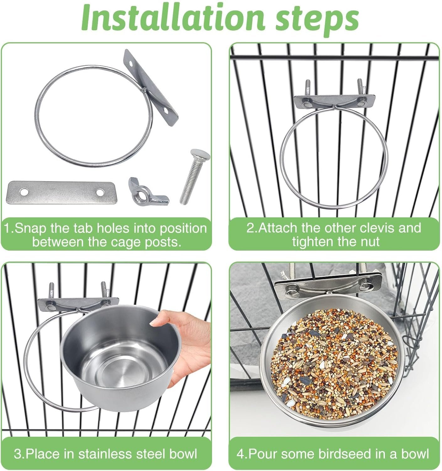 Bowls are easy to clean. They are easy to attach and so far my bird has had an easy time using all of it.