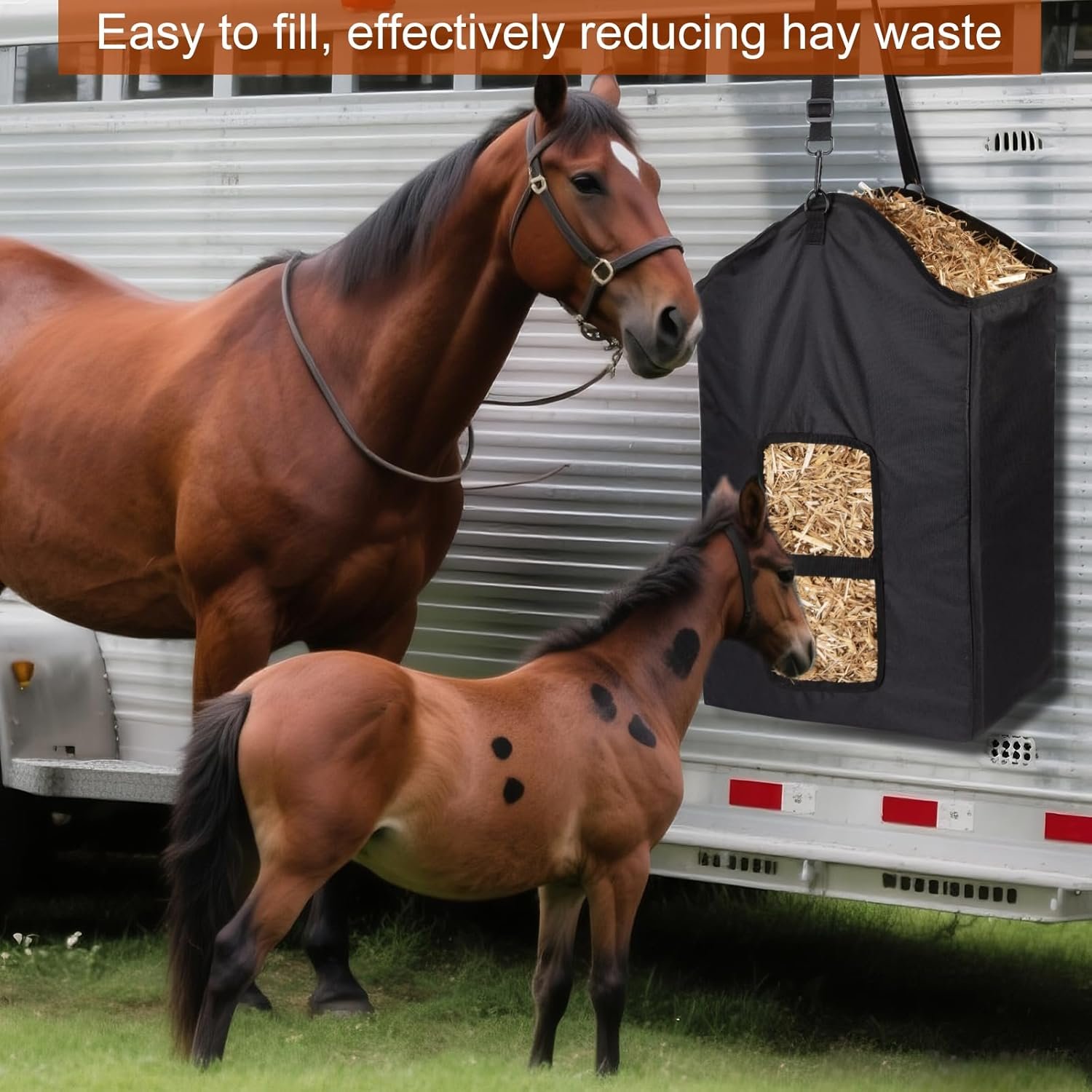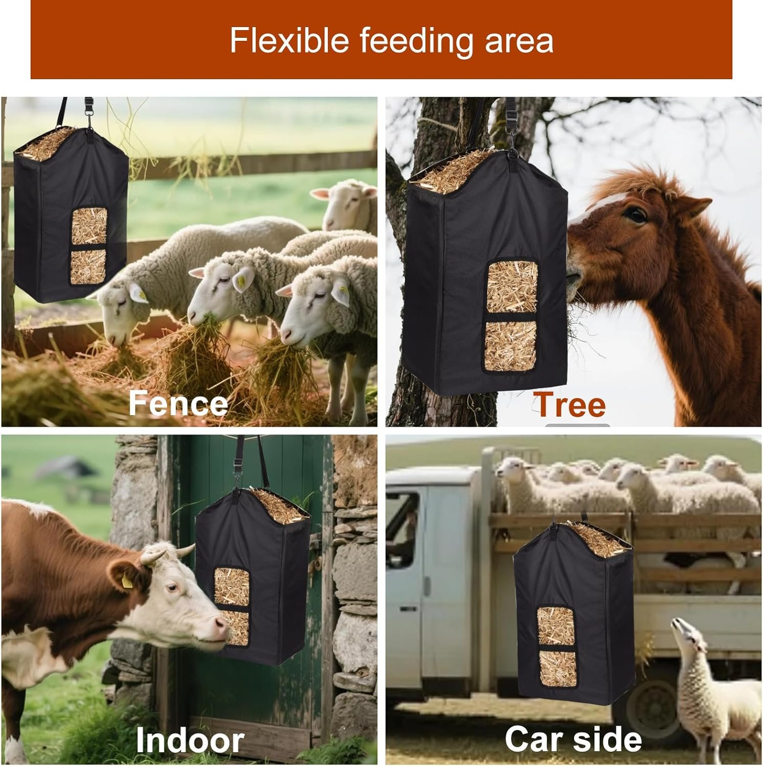 - Reinforced strap allows for flexible hay dispensing and minimizes waste
