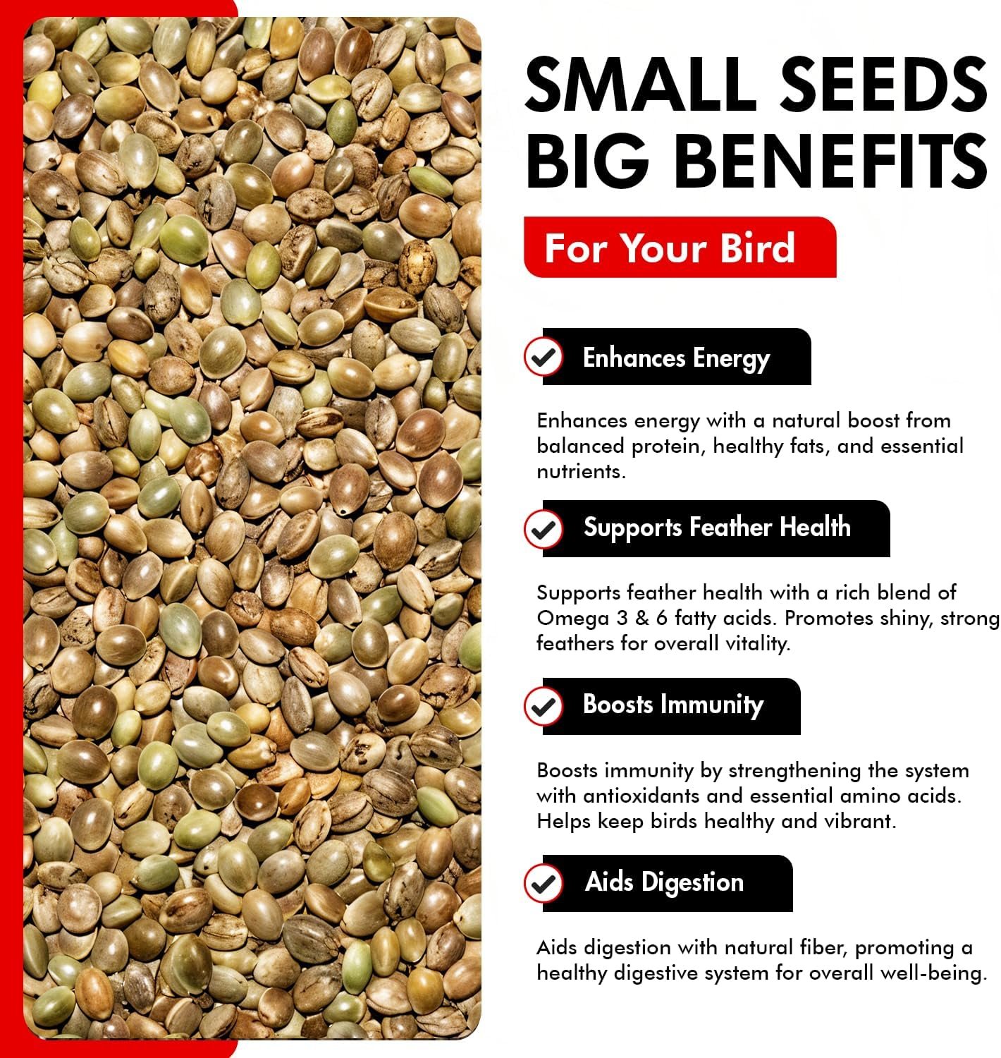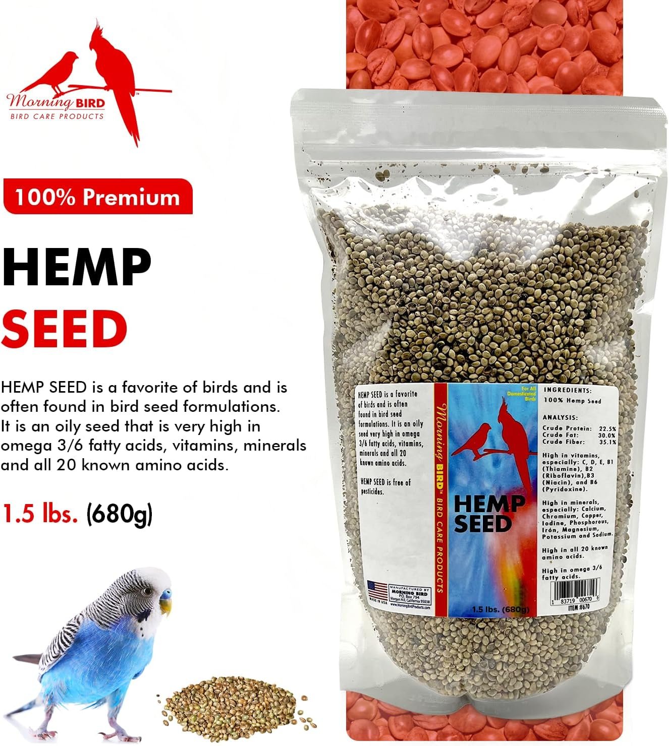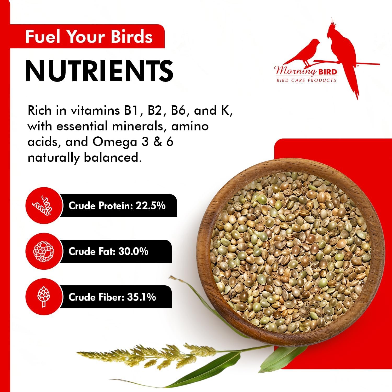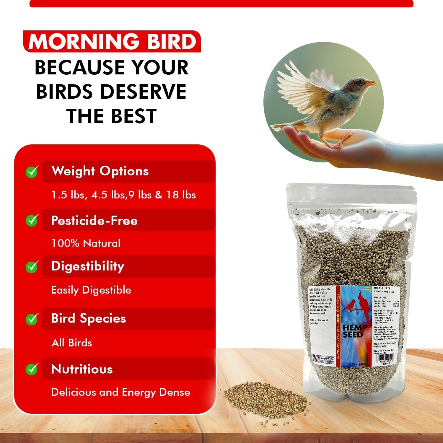 Morning Bird Hemp Seeds are a superfood powerhouse, loaded with essential nutrients that promote a healthy life for all birds. With more than 22% crude protein, 30% crude fat, and rich in protein and natural fats, these seeds deliver a powerful combination of nutrients that support feather growth, heart health, breeding, and overall vitality.
