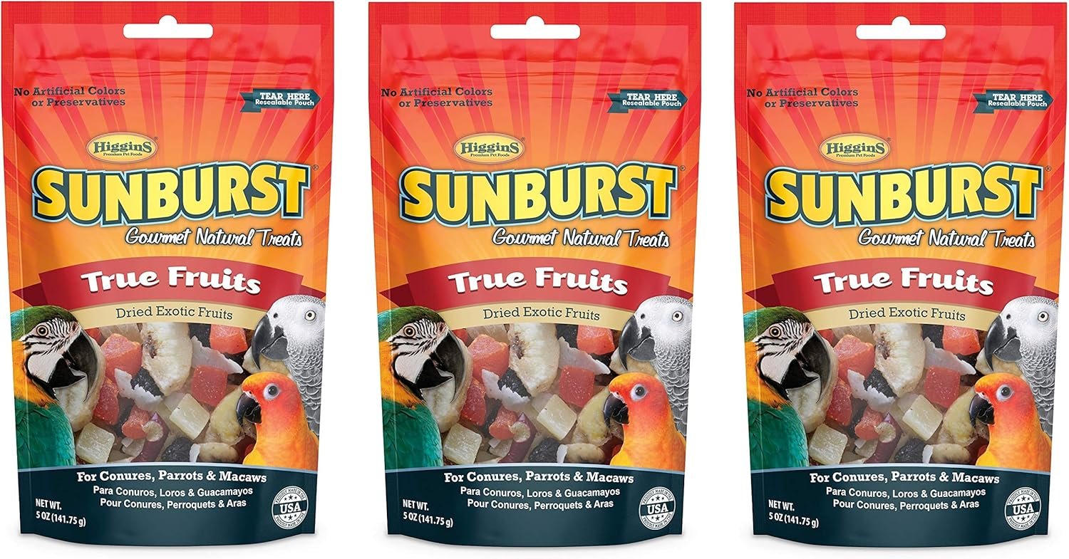 Sunburst Gourmet Natural Treats for birds are an assortment of fun, healthy, natural snack mixes that supplement your pet’s regular diet. True Fruits for Conures, Parrots and Macaws is a blend of all dried, premium exotic fruits like pineapples, bananas, coconuts, dates and more! No fillers just great, delicious, natural fruits for your pet bird!