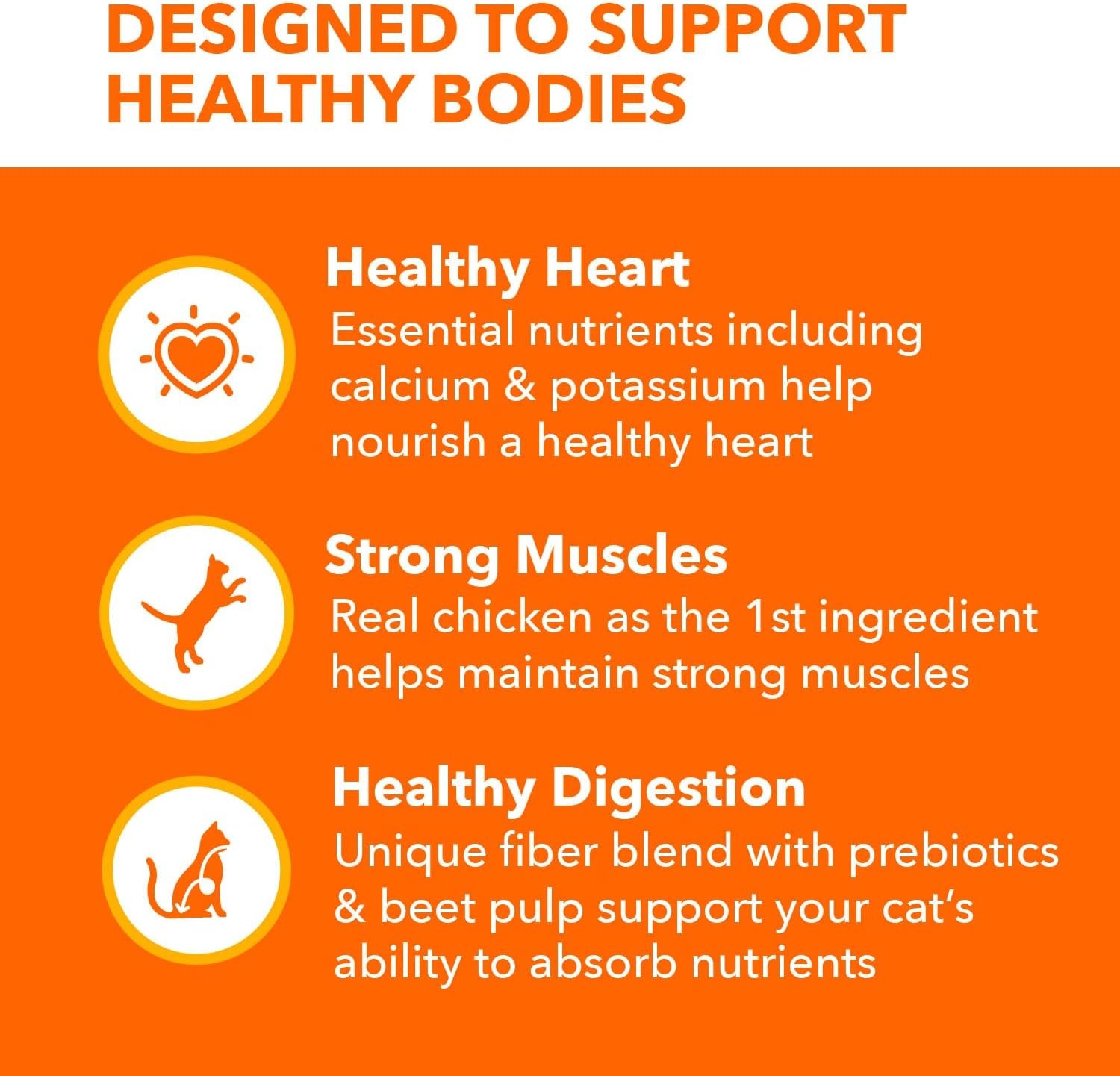 IAMS Proactive Health Healthy Adult Cat Food with Chicken provides 100% nutrition and 0% fillers, supporting whole-body health with essential nutrients and antioxidants. It also supports healthy digestion with natural fiber and prebiotics, and nourishes skin and coat with an optimal Omega 6:3 fatty acid ratio. Additionally, it supports heart health with essential nutrients like calcium and potassium.