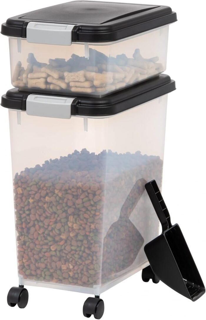 The IRIS plastic airtight container combo is designed to meet your pet food storage needs. The combo includes one 30 lbs / 33 Qt sealed storage container, one 11 lbs / 12 Qt sealed storage container, one matching 2 cup food scoop, and one set of wheels. The sealed storage container features a foam seal and snap-lock latches to keep pet food fresh and keep moisture out.