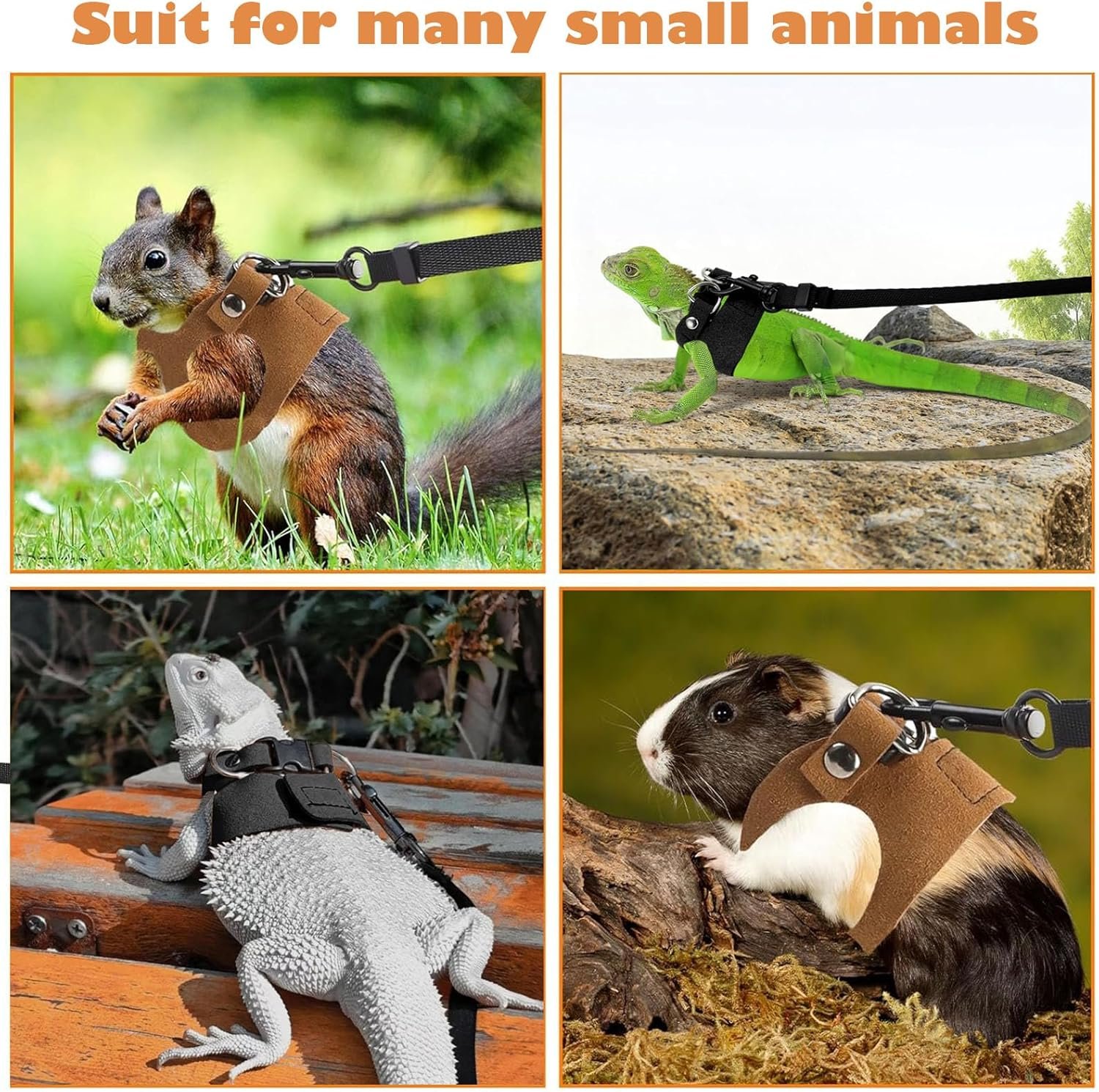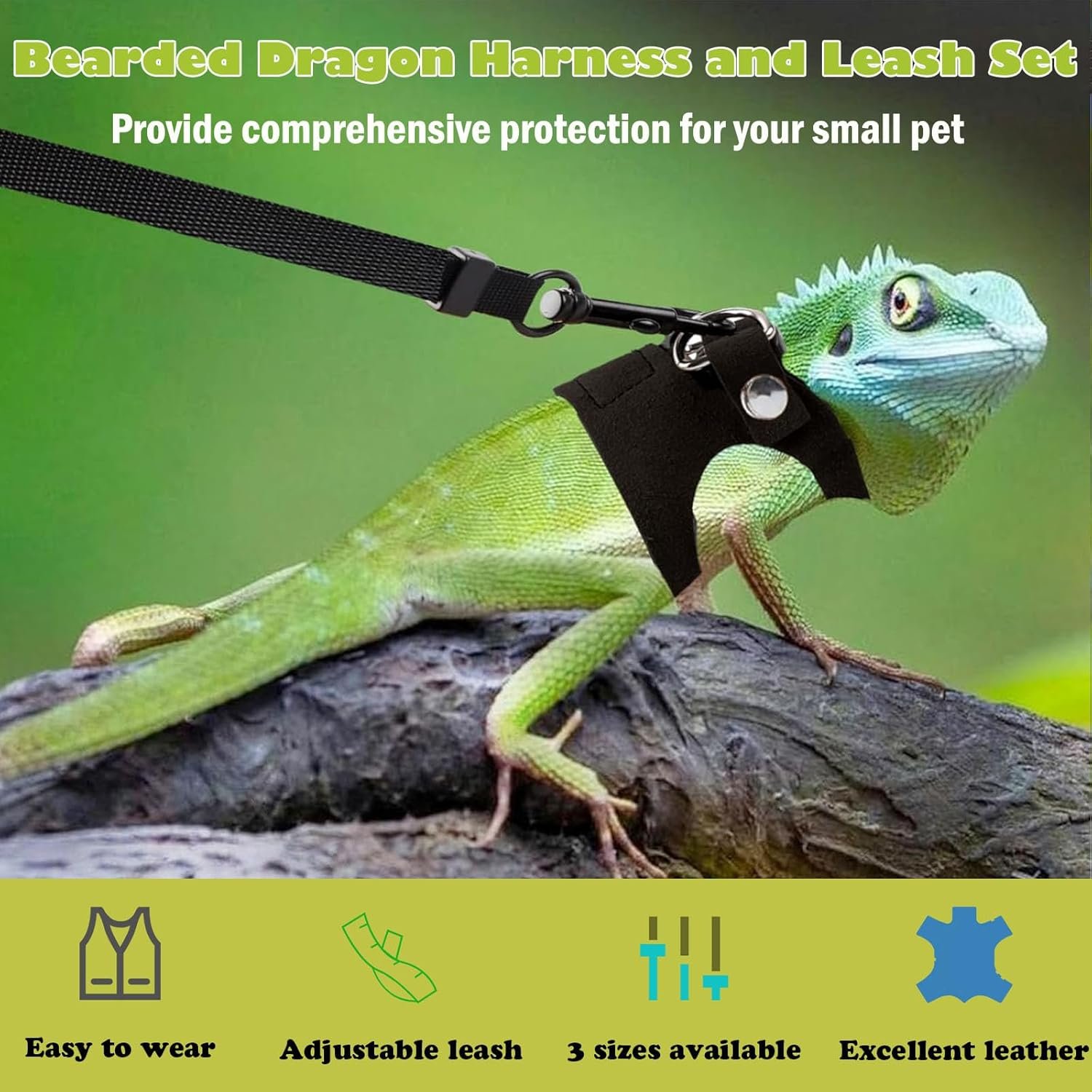 This 3-size pack includes 1 set of bearded dragon harness and leash, with 3 pieces of bearded dragon harnesses of different sizes (S/M/L) and 1 leash (6.5 FT). The harnesses are suitable for bearded dragons with chest circumference 5.9″-8.3″ as well as other small pets.