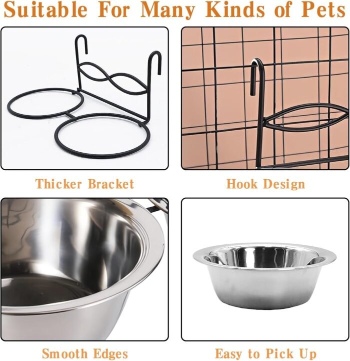 You will receive two stainless steel bird food bowls and a metal bracket with hooks to hang the bowls on the cage. This design is convenient for your pets to eat and is suitable for most cage uses, with no assembly required.