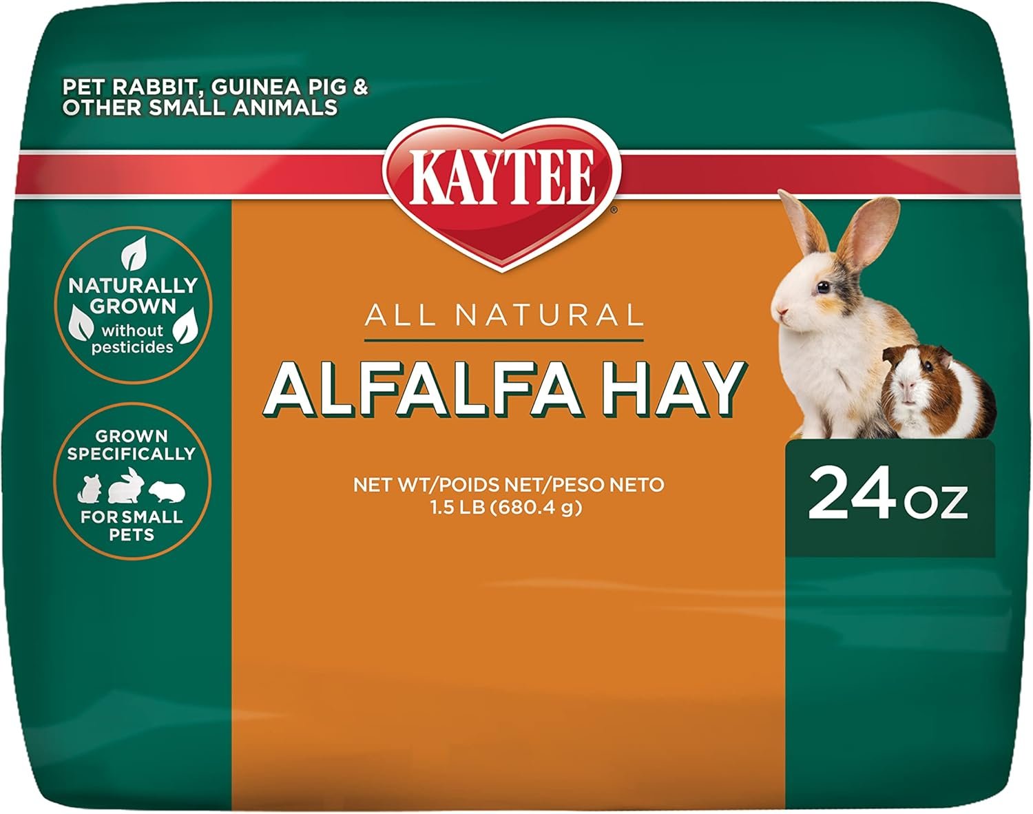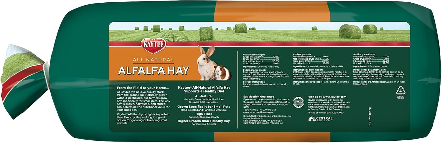 Kaytee is America’s #1 hay brand, and our alfalfa hay is hand selected to ensure long fiber strands and a proper leaf to stem ratio to support your small pet’s digestive health. Satisfaction Guaranteed or your money back.