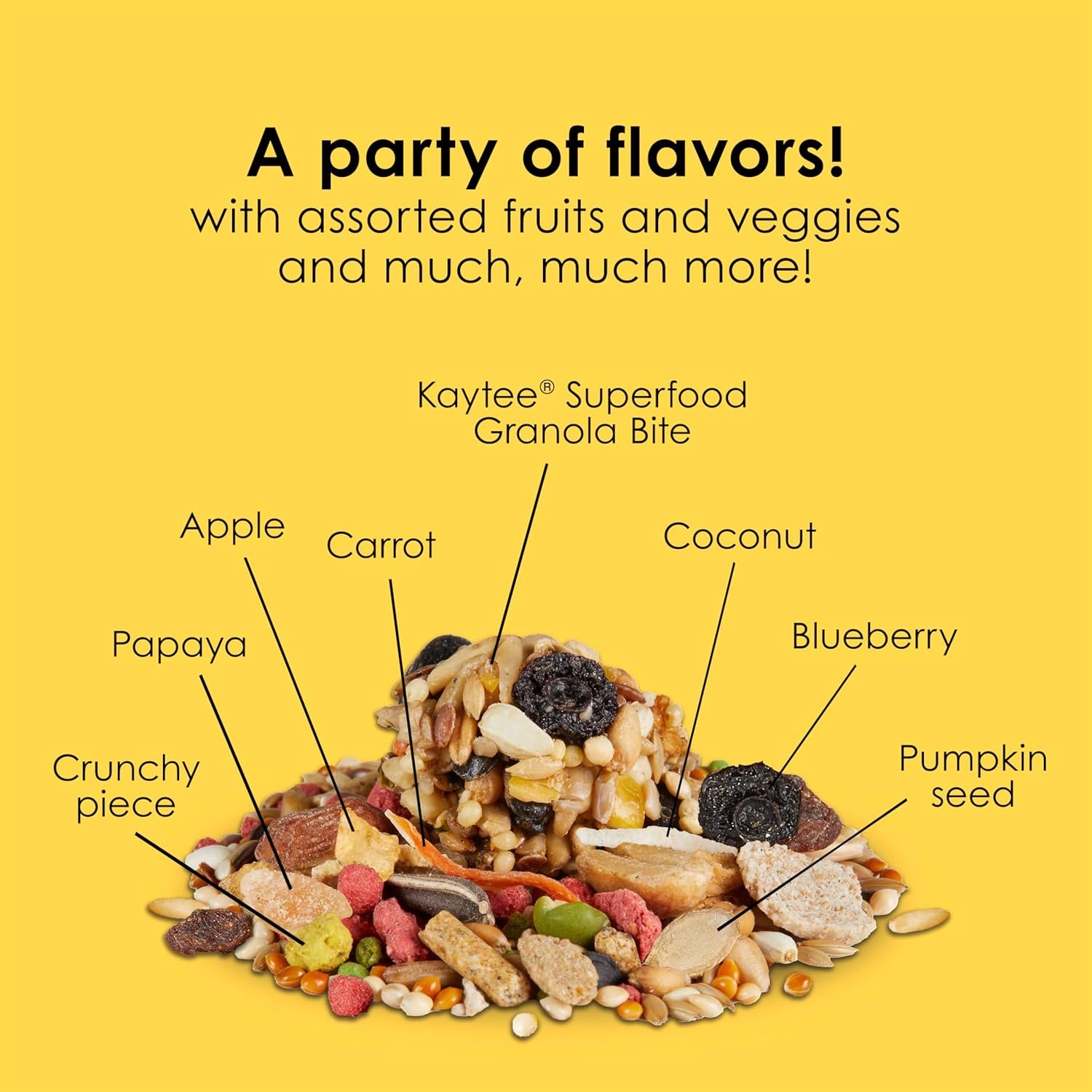 It’s a party at feeding time with Kaytee Fiesta! Kaytee Fiesta Cockatiel Food is a fun-filled, complete diet your animal will love, all while getting the nutrition they need to thrive. Filled with an exciting variety of ingredients, shapes, and textures, this bird food blend engages your pet at feeding time and stimulates their natural foraging instincts to keep them from boredom.