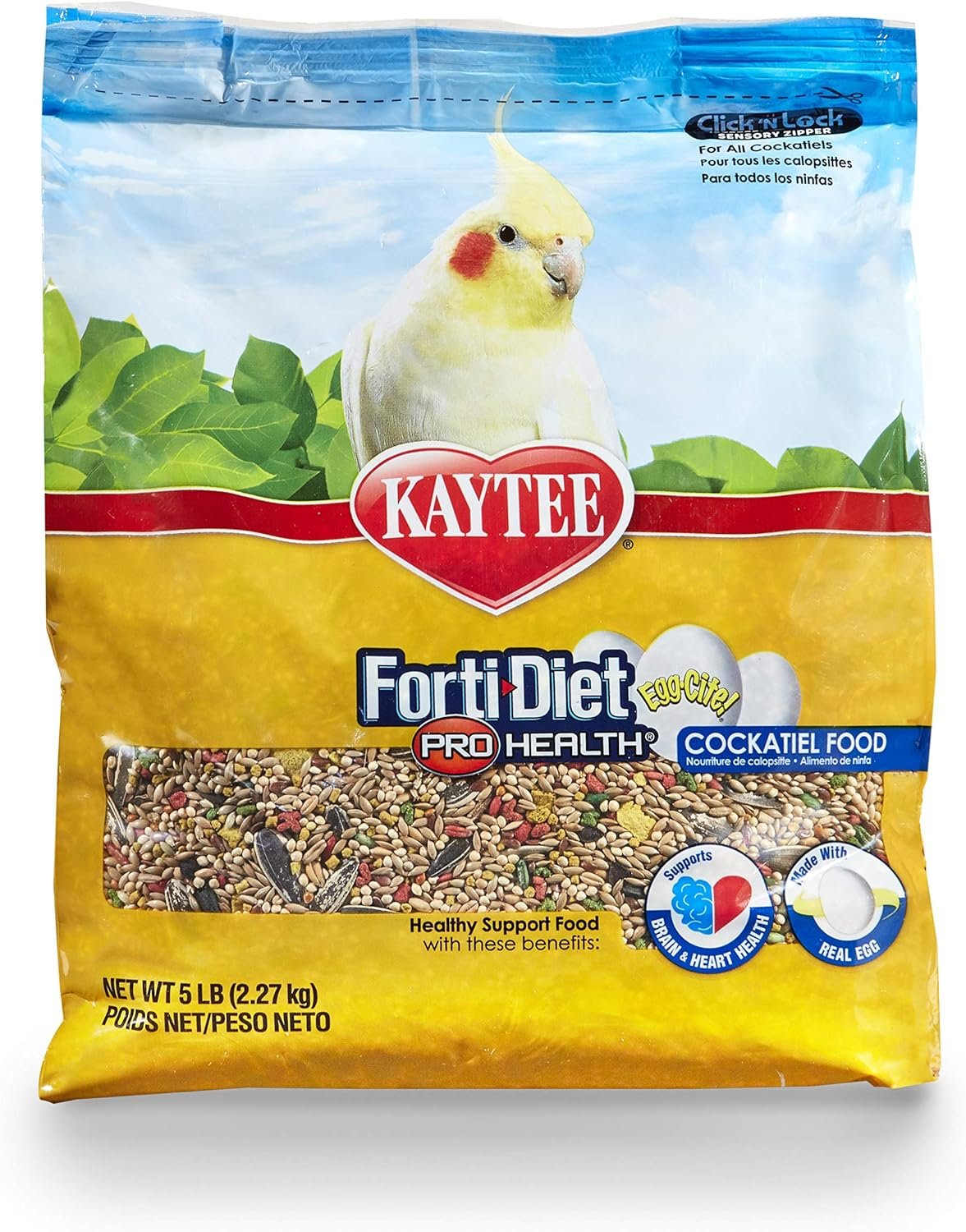 Kaytee Forti-Diet Pro Health Egg-Cite! Cockatiel food was developed by an avian nutritionist to provide the nutrition bird owners have come to expect. This seed and grain-based diet contains Omega 3’s, Probiotics, and Prebiotics, plus farm-fresh egg crumbles. The egg crumbles provide a source of high-quality protein, vitamins, minerals, and essential amino acids, making it especially beneficial during breeding and molting by providing the extra protein birds need.