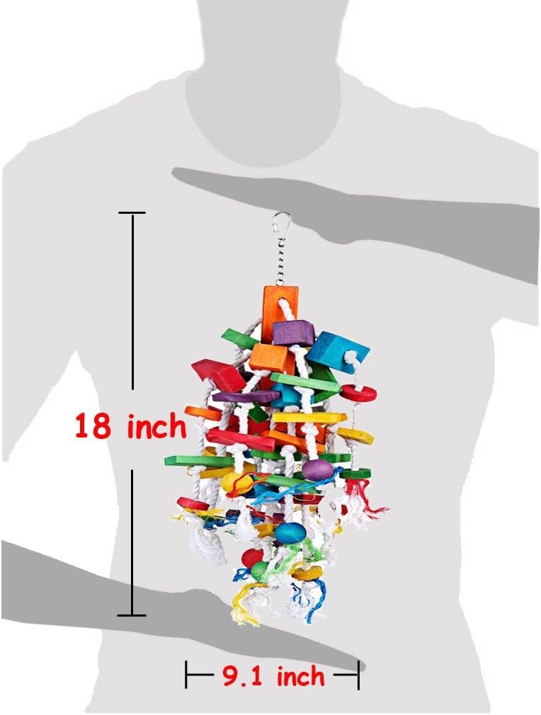 Kintor parrot chewing toys are designed specifically for large and medium-sized parrots, such as Macaws, Cockatoos, African Greys, and Amazon parrots. They measure 18 inches in height and 9.1 inches in width, making them the perfect size for these birds. The toys are made with food-grade materials and are completed with purely handmade craftsmanship, making them more bite-resistant and durable. The unique design of the toys, with multiple layers and vibrant colors, encourages parrots to climb and explore, reducing aggression and loneliness.