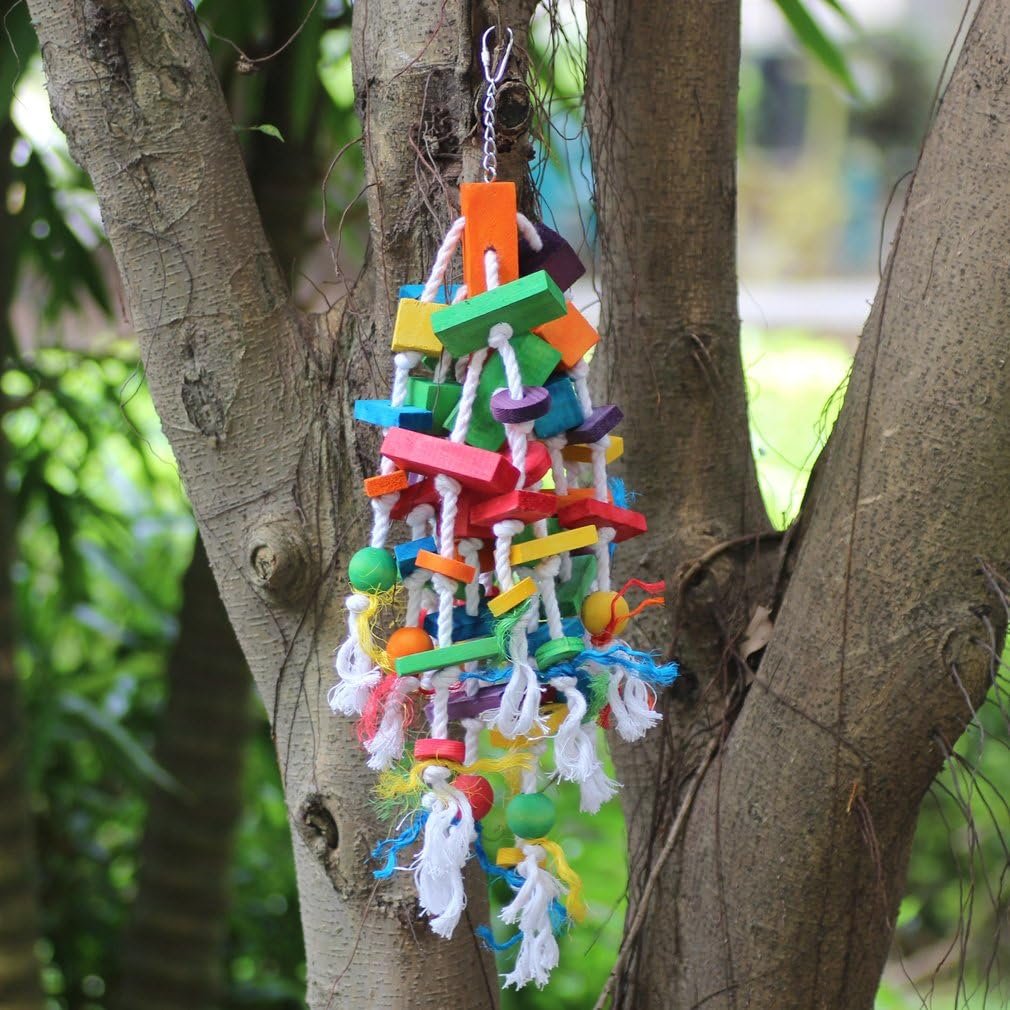 Most toys in this range are either too small or fall apart fast, but this one is built to last. The size is perfect for larger birds like African Greys or Eclectus parrots. Real wood, strong rope, and no weird chemical smell. My Gray and Eclectus are both big fans — they were instantly engaged and stay busy with it.Great size, real materials, and an engaging design.The hanging loop may need reinforcement eventually, but it’s not a dealbreaker.This one stands out in a market full of overpriced junk.