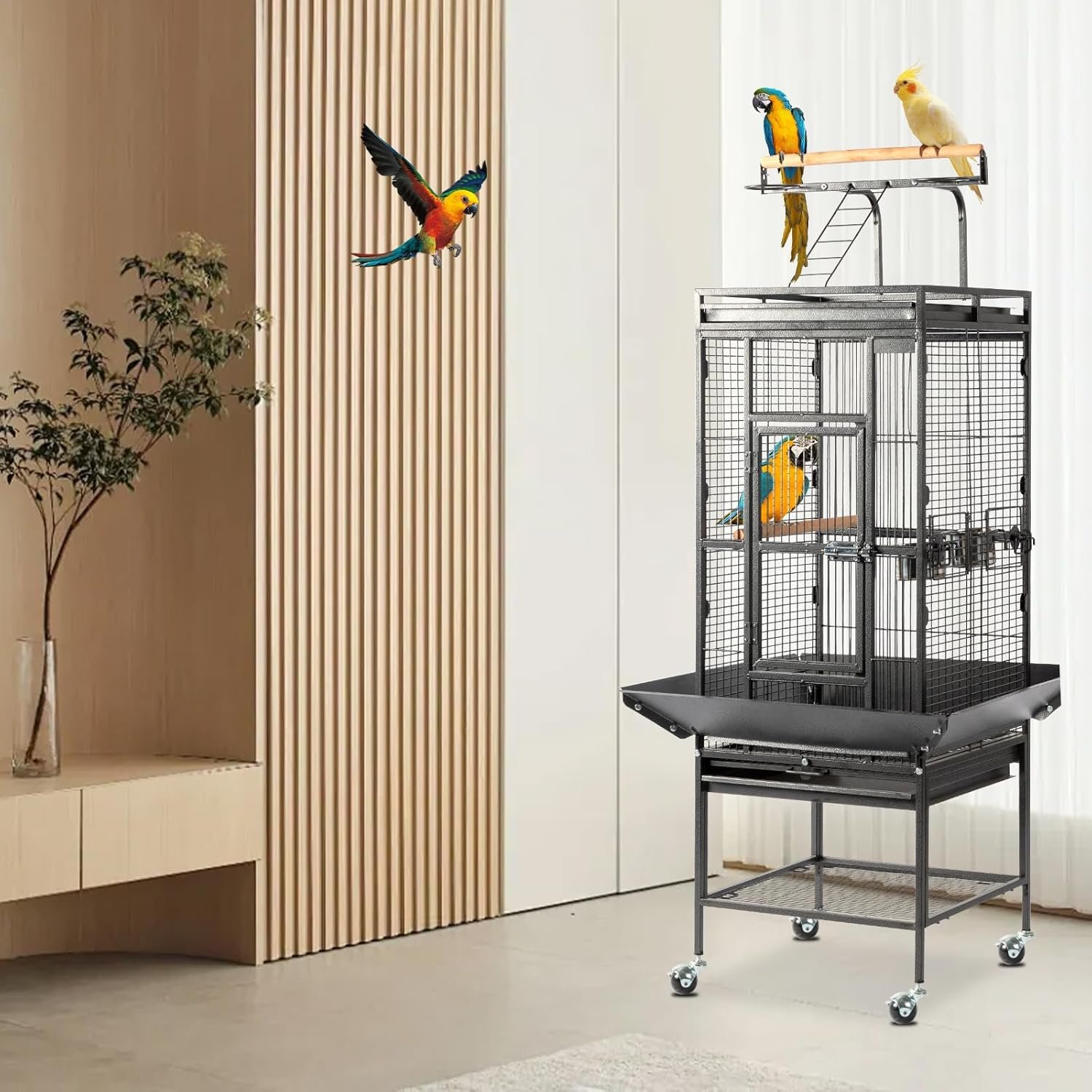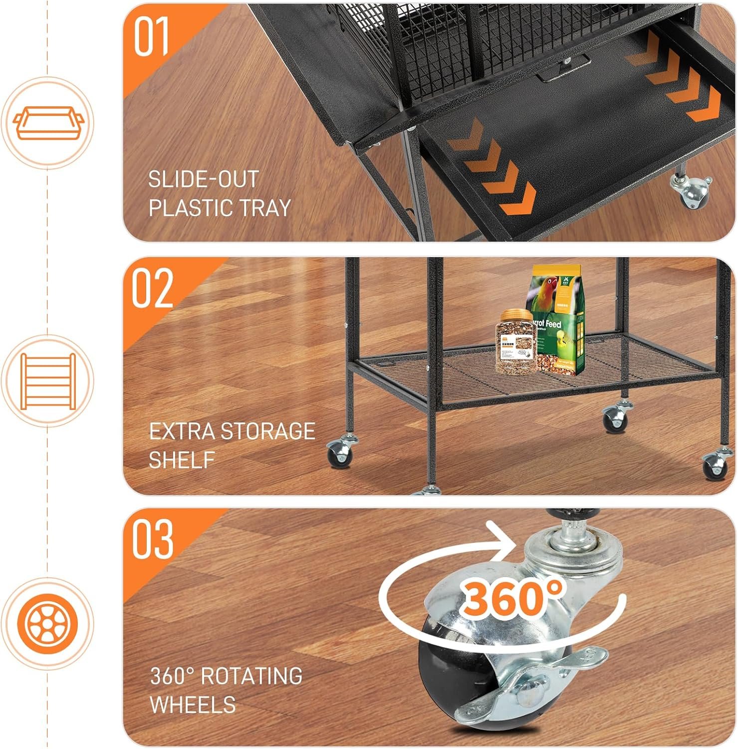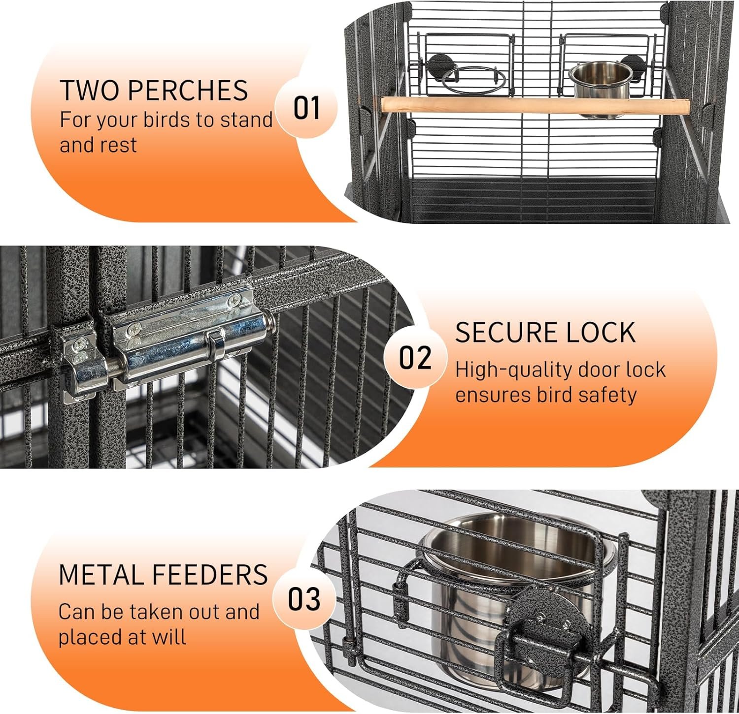 2. Hassle-Free Cleaning & Tidy Space: Equipped with slide-out trays and safety metal grille to catch droppings, plus a seed guard to minimize mess. The double tray system makes cleaning quick and effortless, ensuring a hygienic environment for your birds.