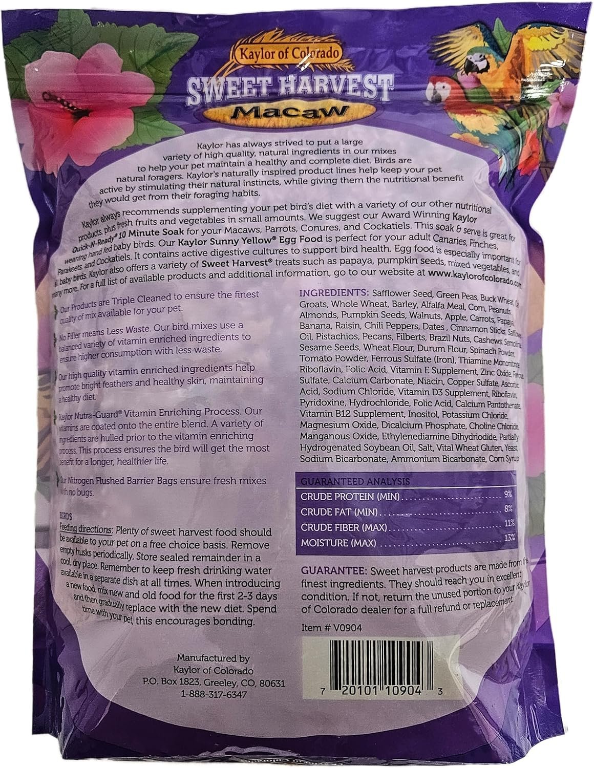KAYLOR Sweet Harvest Macaw Parrot Food is a premium seed mix specifically designed for macaws. The ingredients include Safflower Seed, Green Peas, Buck Wheat, Oat Grouts, Whole Wheat, Barley, Alfalfa Meal, Corn, Peanuts, Almonds, Pumpkin Seeds, Walnuts, Apple, Carrots, Papaya, Banana, Raisin, Chili Peppers, Dates, Cinnamon Sticks, Safflower Oil, Pistachios, Pecans, Filberts, Brazil Nuts, Cashews, Semolina, Sesame Seeds, Wheat Flour, Durum Flour, Spinach Powder, Tomato Powder, Ferrous Sulphate (Iron), Thiamine Mon nitrate, Riboflavin, Folic Acid, Vitamin E Supplement, Zinc Oxide, Ferrous Sulphate, Calcium Carbonate, Niacin, Copper Sulphate, Ascorbic Acid, Sodium Chloride, Vitamin D3 Supplement, Riboflavin, Pyridoxine, Hydrochloride, Folic Acid, Calcium, Vitamin B12 Supplement, Inositol, Potassium Chloride, Magnesium Oxide, Calcium Phosphate, Choline Chloride, Manga nous Oxide, Partially Hydrogenated Soybean Oil, Salt, Vital Wheat Gluten, Yeast, Sodium Bicarbonate, Ammonium Bicarbonate.