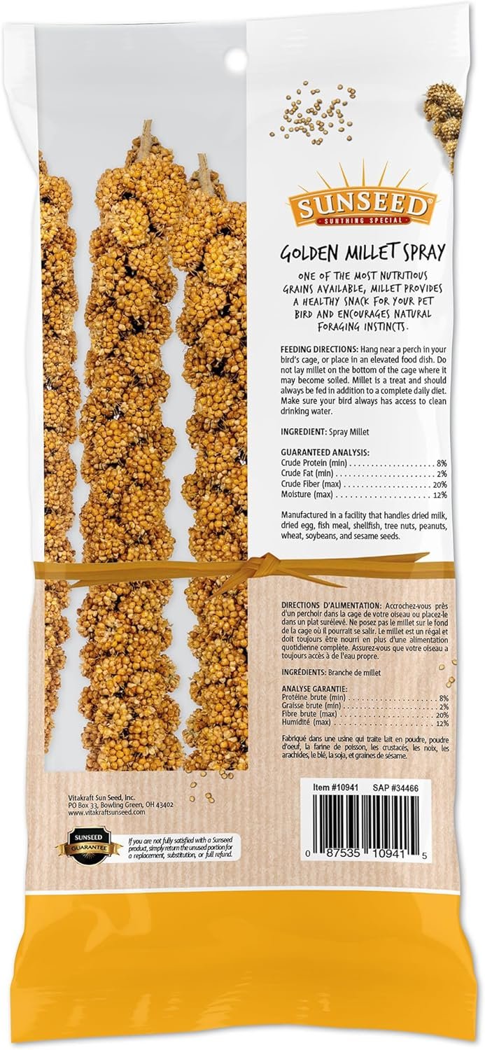 The Sun Seed Company Millet Spray is a nutritious and entertaining treat for companion birds. Made from all-natural ingredients, this low-fat treat aids in digestion and helps ease stress in birds.