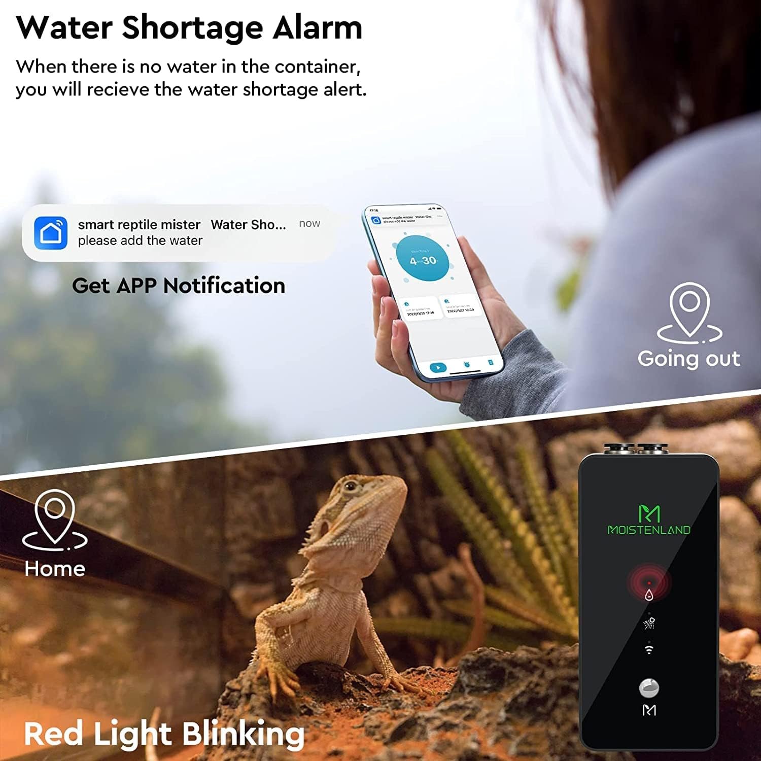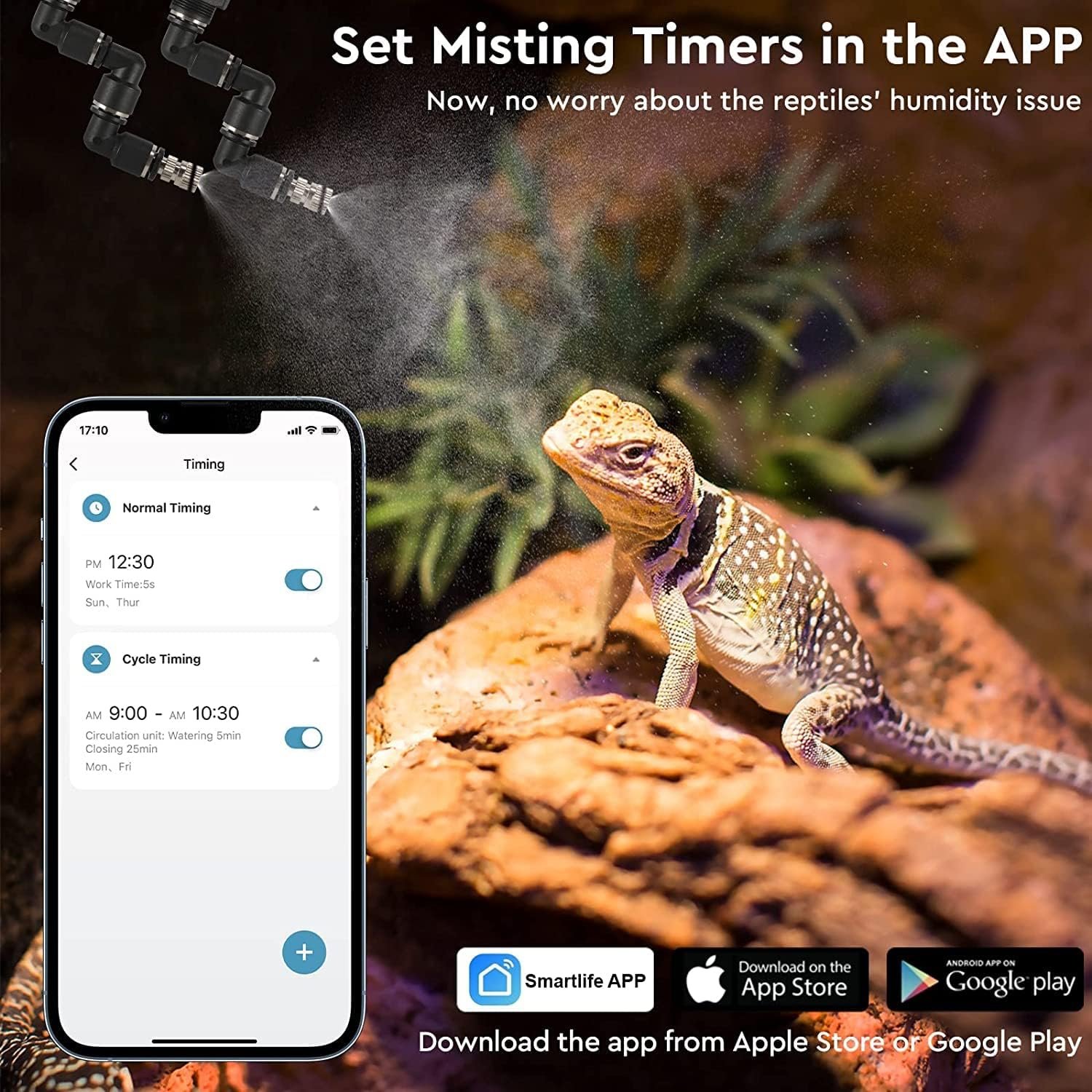 Moistenland wifi reptile mister allows you to set the misting frequency and duration of each misting session. You can set up custom misting schedules based on the needs of your reptiles and the ambient temperature and humidity of your environment.