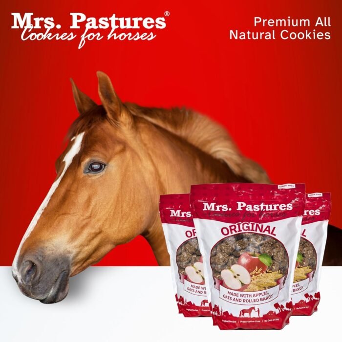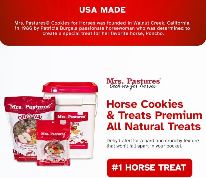 Mrs. Pastures Cookies for Horses was founded in Walnut Creek, California, in 1986 by Patricia Burge, a passionate horsewoman who was determined to create a special treat for her favorite horse, Poncho. Made with all-natural, simple ingredients, Mrs. Pastures horse cookies were made to help nourish the human-horse bond. Originally designed with picky eaters in mind, try using them in your next training session — these special snacks have helped improve ground manners, trailer loading, mounting block patience and more!