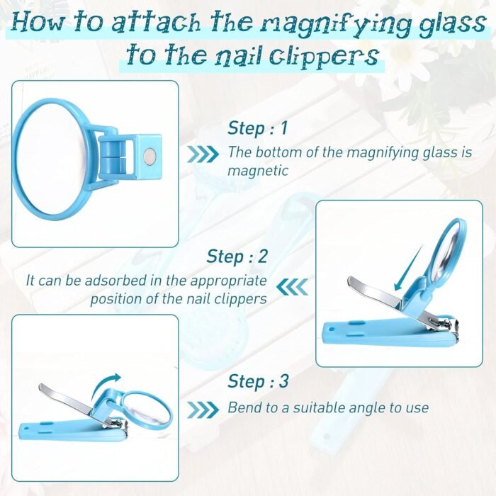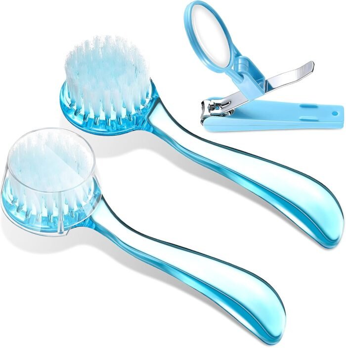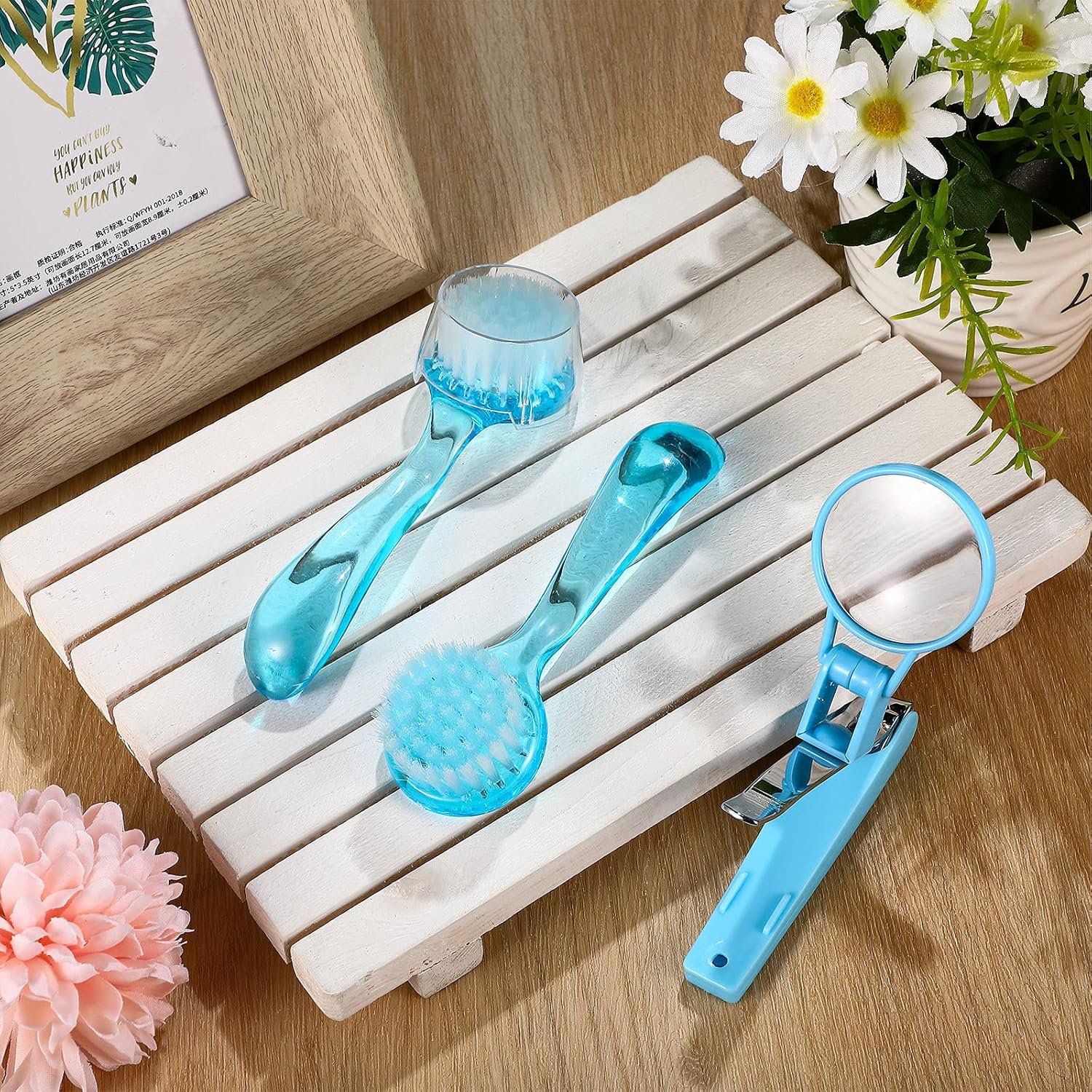 The bathing brush measures 13 cm/ 5.1 inch in total length and is made of plastic, available in blue color. The nail clipper with magnifier measures 9 cm/ 3.5 inch in length and 4 cm/ 1.6 inch in diameter, also made of plastic and carbon steel, and available in blue color. The package includes 2 bathing brushes and 1 nail clipper with magnifier.