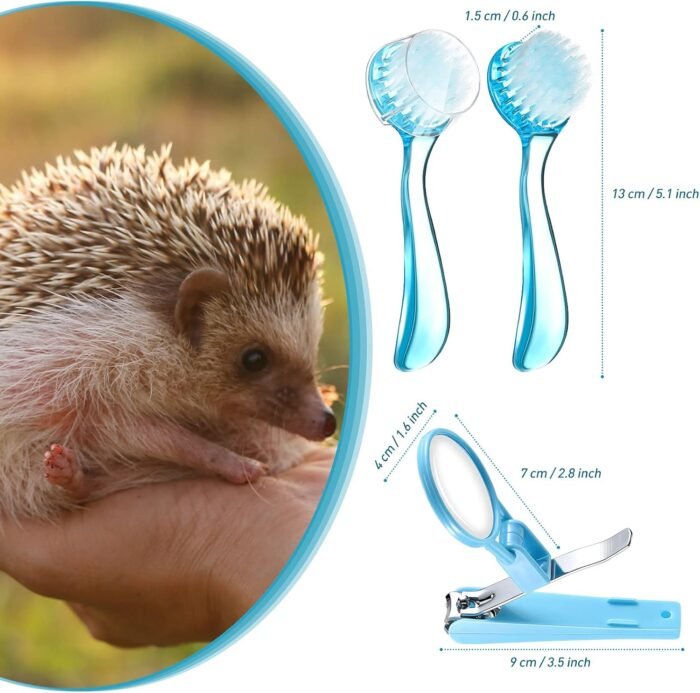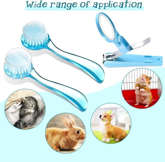 You will receive 2 pieces of soft bathing brushes in blue and a nail clipper with magnifier in blue, a nice quantity of tools to keep your pet clean. The multiple functions of the soft bristle brush make it a practical tool for small pet bathing, grooming, and massaging, helping your pet feel relaxed and improving circulation during bath time. The nail clipper with magnifier is convenient to use, allowing for quick and precise cuts without hurting your pet, and the magnifier clearly identifies the nails of small pets. The mini size of the tools is suitable for small pets like kittens, cats, rabbits, puppies, chinchillas, and guinea pigs, providing them with a comfortable feeling and clean nails to keep them healthier.