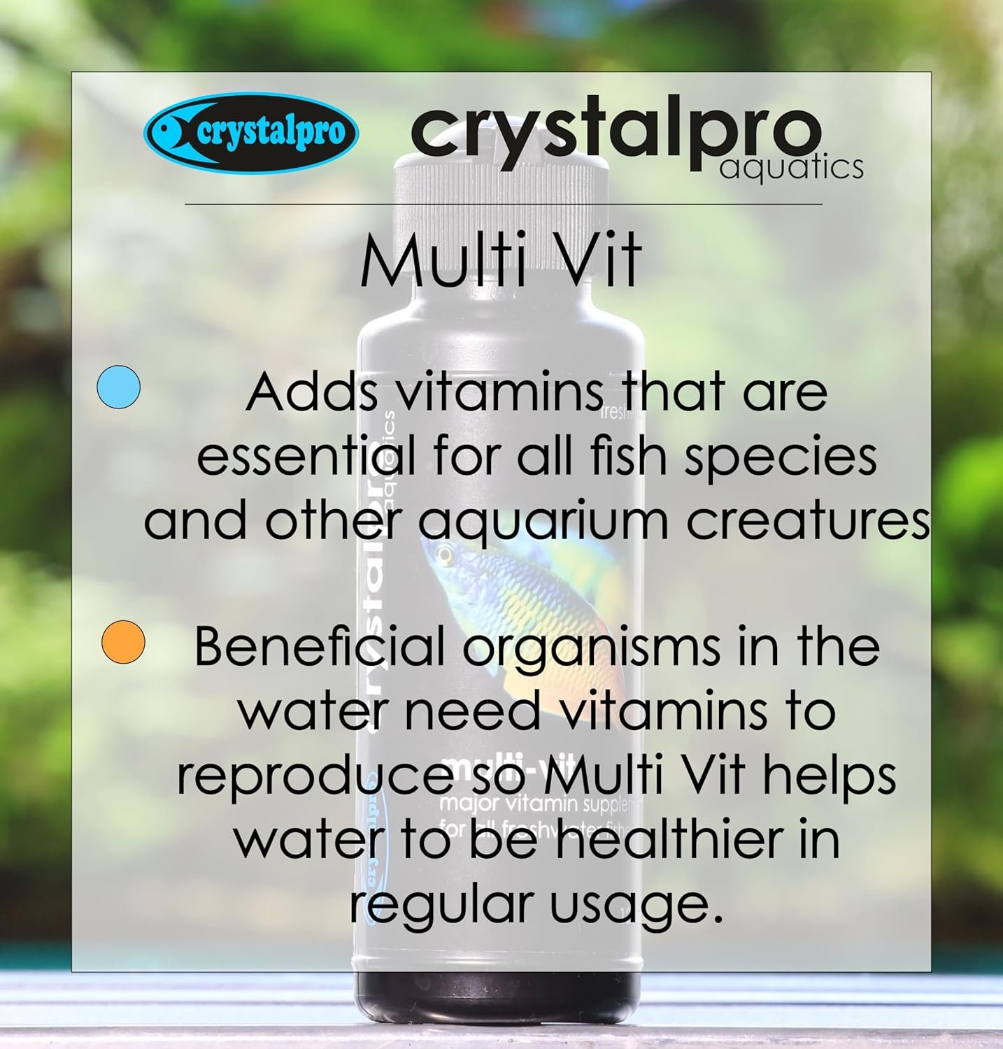 Crystalpro Multi-Vit provides essential vitamins to all fish species and other aquarium creatures, supporting healthy growth and metabolism. These vitamins are crucial for the reproduction of beneficial organisms in the aquarium, leading to healthier water in regular usage.