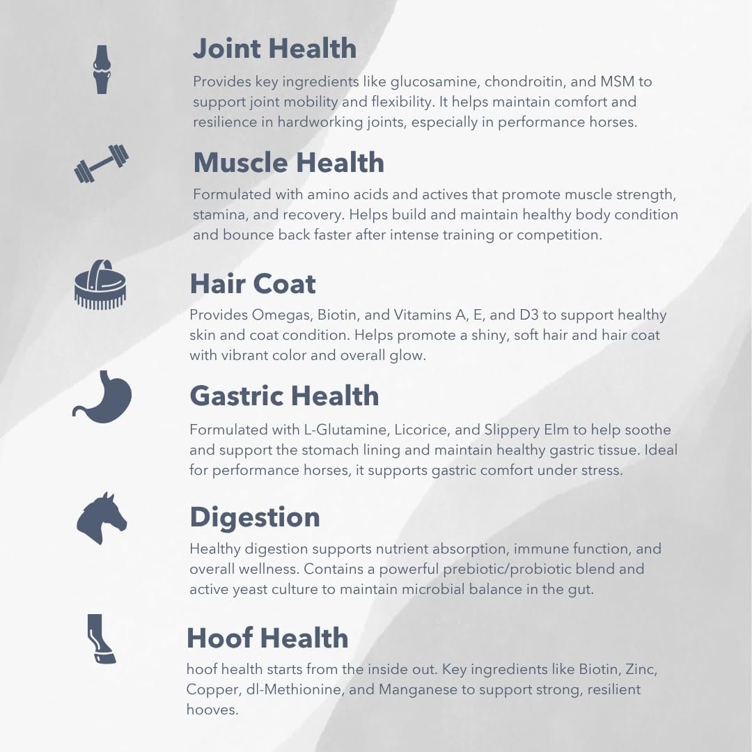 - Supports joint, muscle, hoof, gastric, hair coat, and digestive health