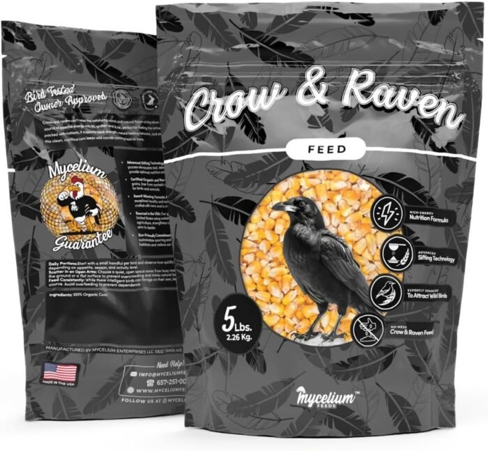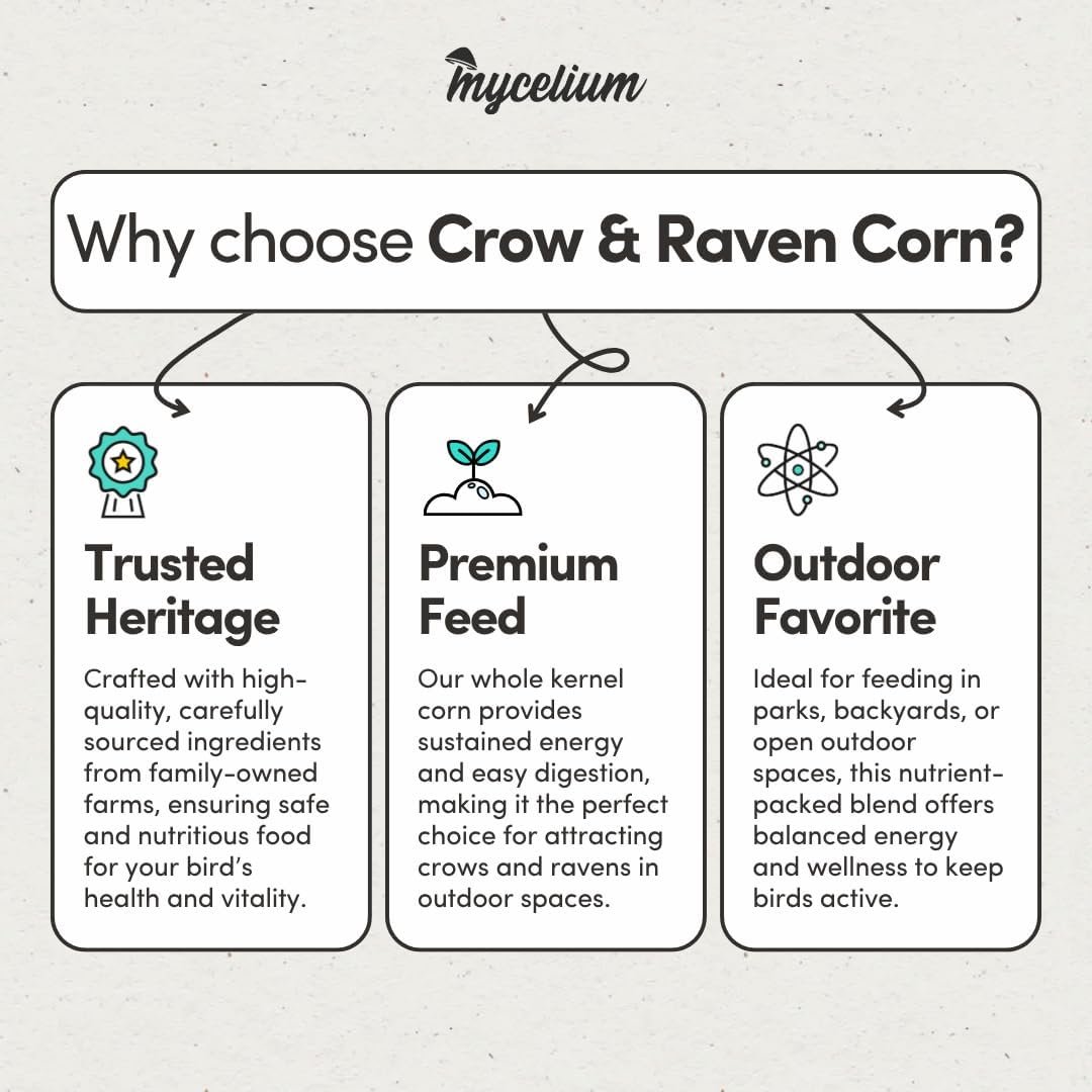 Mycelium Bird Food is a high-quality, organic whole corn feed designed for wild bird feeding. Grown in the USA using organic, non-GMO practices, this product is perfect for feeding crows, ravens, ducks, geese, and a variety of backyard and wild birds.