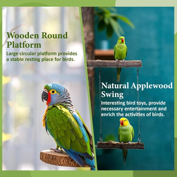 • 4 Types of Bird Perches: Includes 2 grapevine Y-shaped perches, 3 pepperwood claw perches, 2 round platforms, and 1 applewood swing.