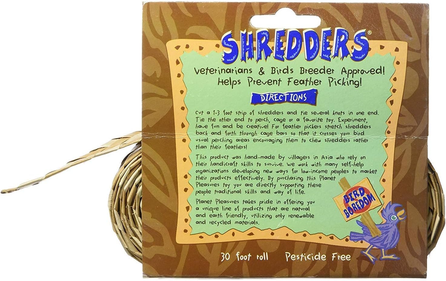 I have two parakeets and one of them picks his feathers on occasion. He does this despite having a parakeet companion, a very large flight cage, plenty of toys, fresh water and veggies, and fresh food. Fortunately these shredders seem to keep my picker occupied enough that he doesn’t pick his own feathers.This is the first time I’ve ordered the natural, non-colored shredders. The last time I purchased these it was from a local bird shop- it was the same product but they were multicolored palm leaf strips.What I’ve found that works best is to cut off about 6 inches to 1 foot of the roll and then tie it in a bunch of knots on the sides of their cages and to the bottom of some of the long wooden bowels. They will pick at these and chew them up until they fall off of the wooden bowels to the bottom of the cage. That is when I cut off another strip and retie it to the cage and wooden perches.