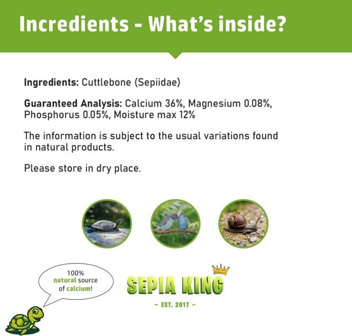 Sepia King Cuttlebone is a 100% natural source of minerals and calcium for birds, reptiles, and invertebrates. Since 2017, Sepia King has been producing high-quality supplementary pet food, standing out for its commitment to excellence and customer satisfaction.