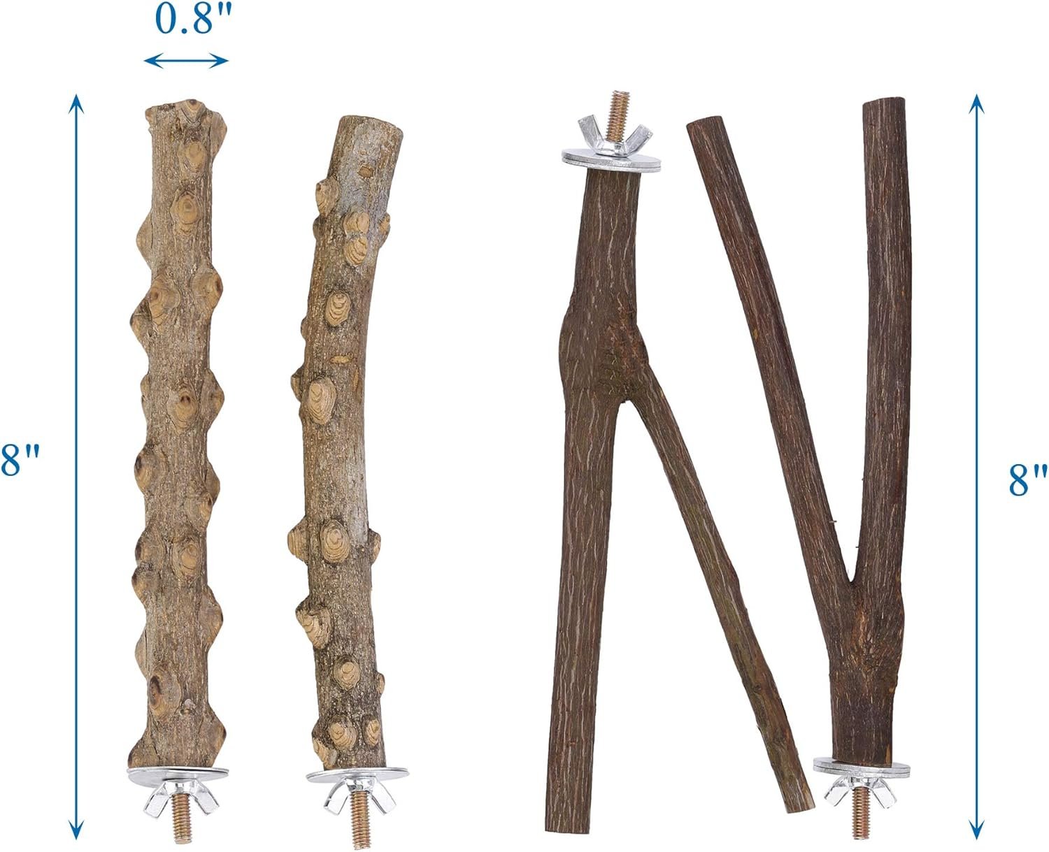 The branch is approximately 7.9″ long and 0.6-0.8″ in diameter, while the straight stick is 7.9″ long and 0.8″ in diameter. This product is recommended for canary, finch, budgie, cockatiel, finch, small parrot, parakeet, canaries, and other small birds. It can fit 3-4 birds at the same time.