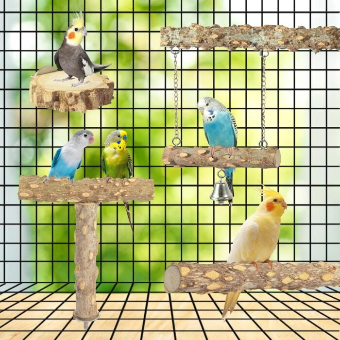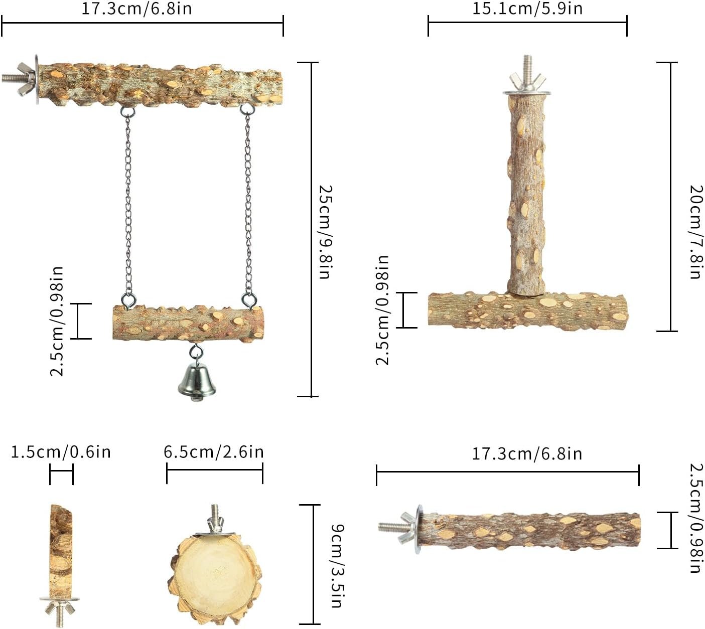 Complete Set for Bird Enjoyment: Our bird perch set includes 1 Wooden Perch, 1 O-Shaped Platform, 1 Bird Swing, and 1 T-Shaped Perch, offering a variety of perch types to simulate a natural habitat for your birds, promoting natural behaviors.