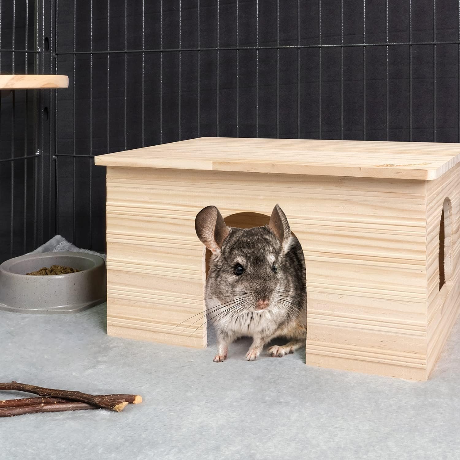 A natural, solid-wood hideout for your guinea pig, chinchillas & other small animals. Constructed from quality timber, provide pets with a natural sense of security. The roof can be used as a habitat, you can add cloth cushions, or put food to the roof. Unfinished wood for natural look.