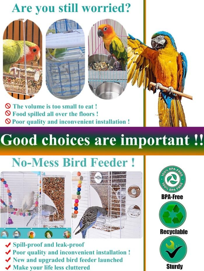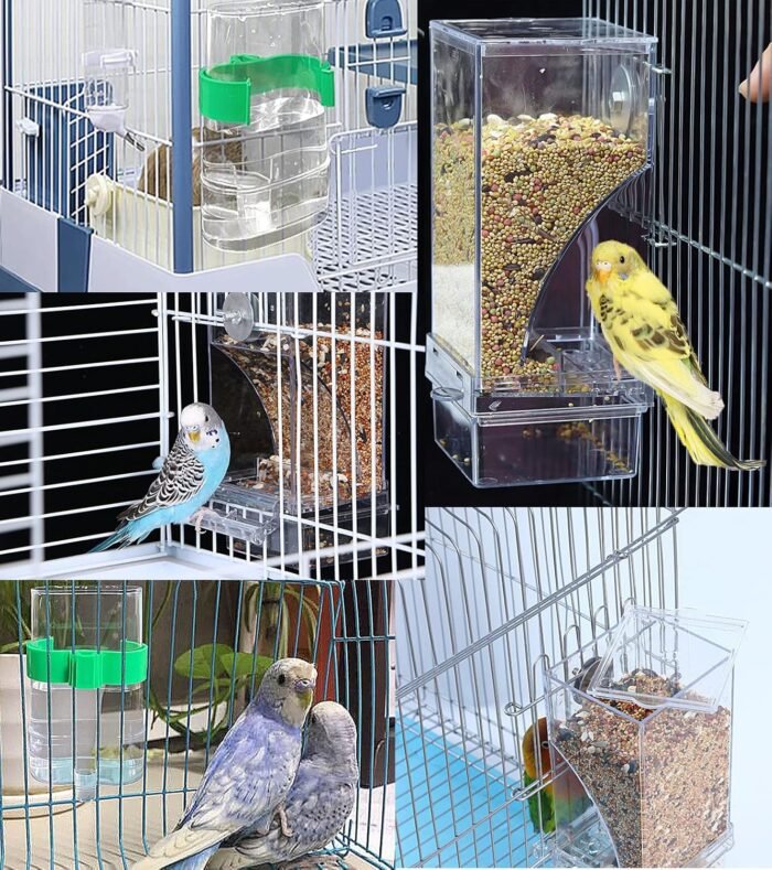 Our 2 Pack No Mess Bird Feeder Water Dispenser set is designed to provide a convenient and mess-free way to feed and hydrate your birds. The set includes a parrot seed feeder and a parrot water dispenser, perfect for parakeets, cockatiels, budgies, macaws, finches, canaries, parrots, lovebirds, starlings, mynahs, and other small to medium-sized birds.