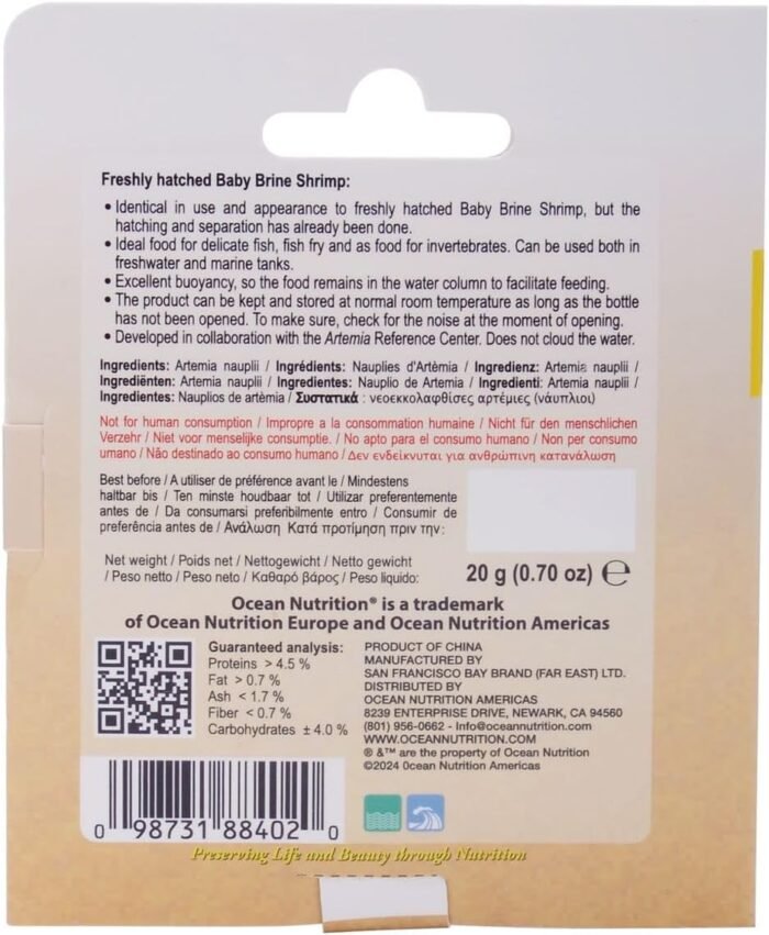 The baby brine shrimp by Ocean Nutrition come ready-to-use in a saline solution, making them a convenient option for aquarium owners. Key features include: