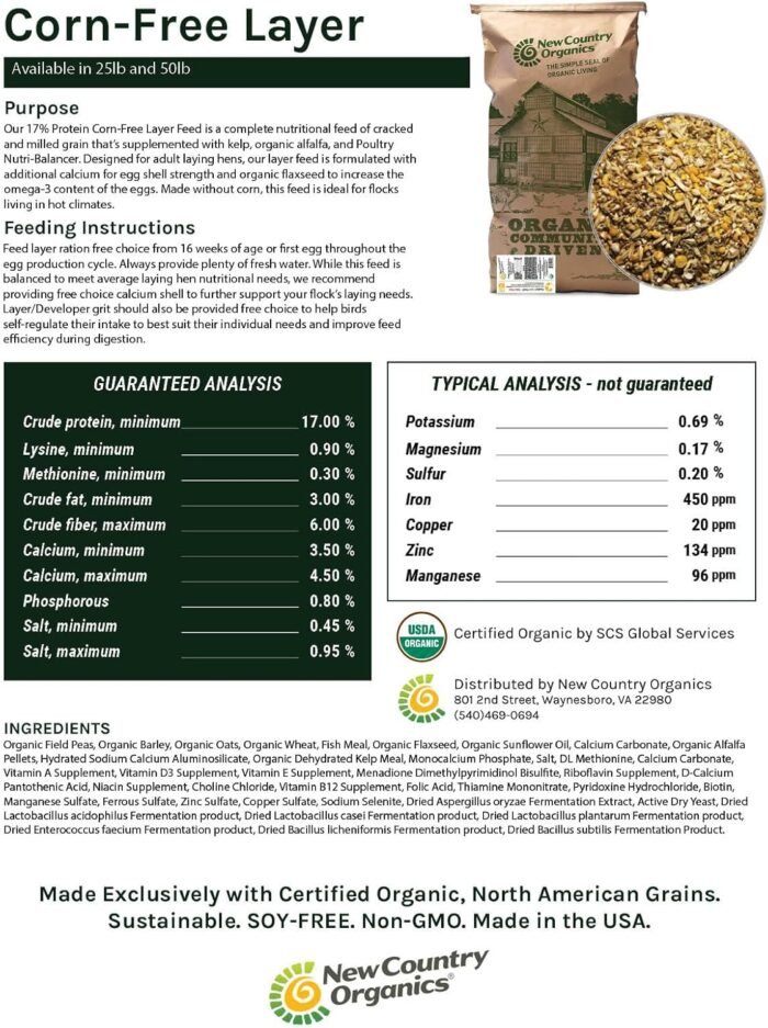 I have raised my birds since they were chicks on New Country from Starter and Grower feed to this Layer feed. It’s easy to ferment and the girls love that, but they also really enjoy it unfermented as well. I chose corn free due to being in very HOT Texas and only supplement cracked corn when the weather gets in the mid-thirties and under, which is not very often. They hit the grower stage in November and seemed to need supplemental protein even on the grower formula, but that may be due to the cold and filling out the rest of their feathering all at the same time. When I started them on this Layer feed they were really excited about it. Opening the bag it looked great, very clean and dry with a good smell. The girls don’t seem to need as much of it either now that they finished out their initial growth spurt. This really is a great brand and worth the price for happy, disease-free birds, who love to bounce around and play.