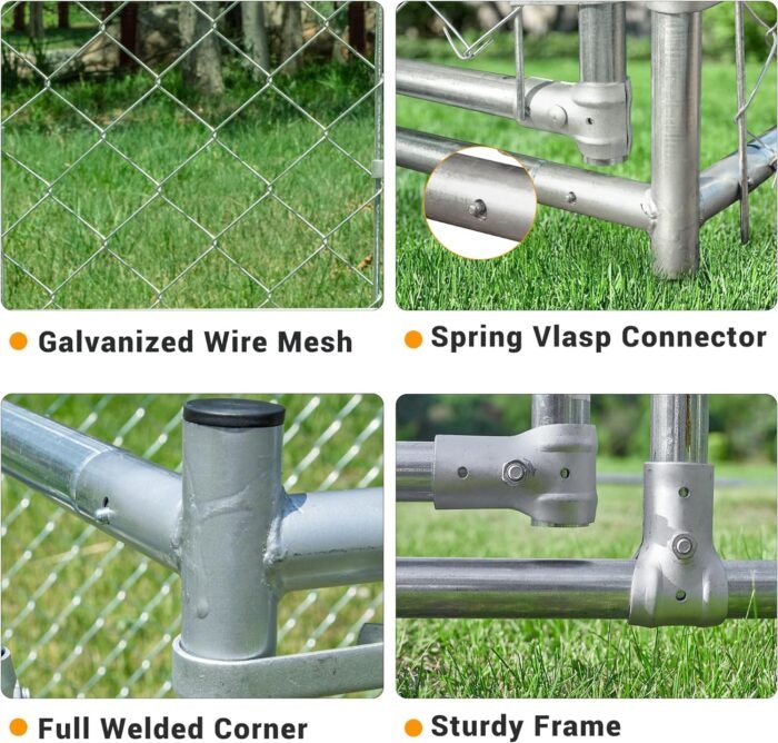 The HEASON Large Dog Kennel is made for outdoor pets, providing a spacious area for them to freely move around. It features an upgraded structure and stronger material, including 1.25-inch thick galvanized metal pipes and 2.5mm steel wire mesh. The kennel has raised legs that can be inserted into the ground to ensure stability and prevent easy movement. A protective waterproof tarp cover made of durable Oxford cloth with a silver coating provides a comfortable, warm, and safe home for pets.