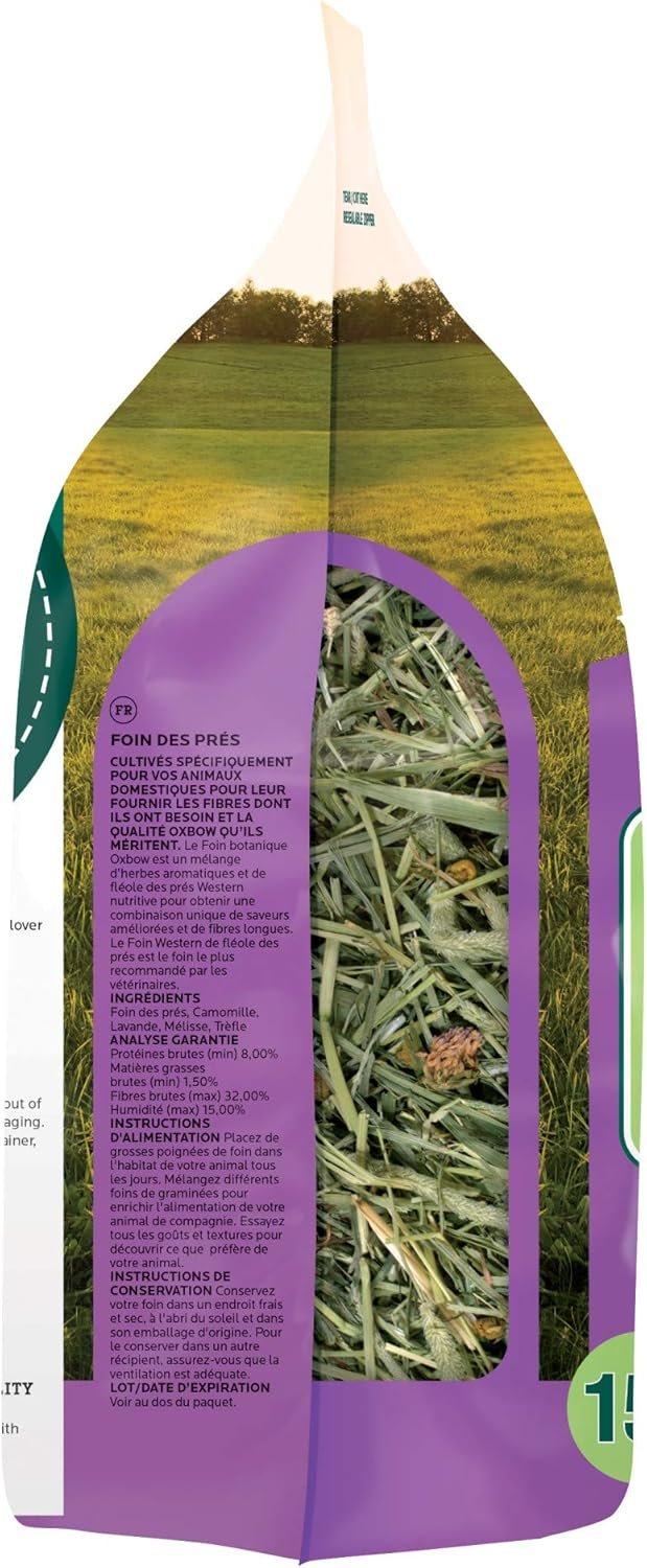 Oxbow Botanical Hay is a premium blend of fragrant, high-fiber grass hay and aromatic herbs, designed to promote healthy digestion and encourage natural foraging in rabbits, guinea pigs, chinchillas, and other small herbivores. This unique combination of hand-selected Western timothy hay and carefully chosen herbs such as chamomile, lemon balm, lavender, and clover enhances mealtime variety while supporting your pet’s physical and mental well-being.