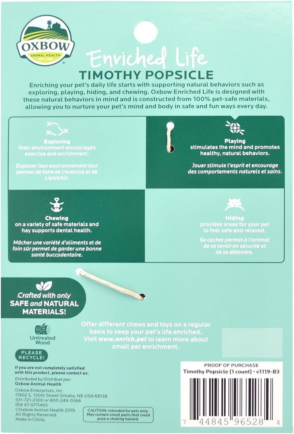 Enriching your pet’s daily life starts with supporting natural behaviors such as exploring, playing, hiding, and chewing. Oxbow Enriched Life is designed with these natural behaviors in mind and is constructed from 100% pet-safe materials, allowing you to nurture your pet’s mind and body in safe and fun ways every day.