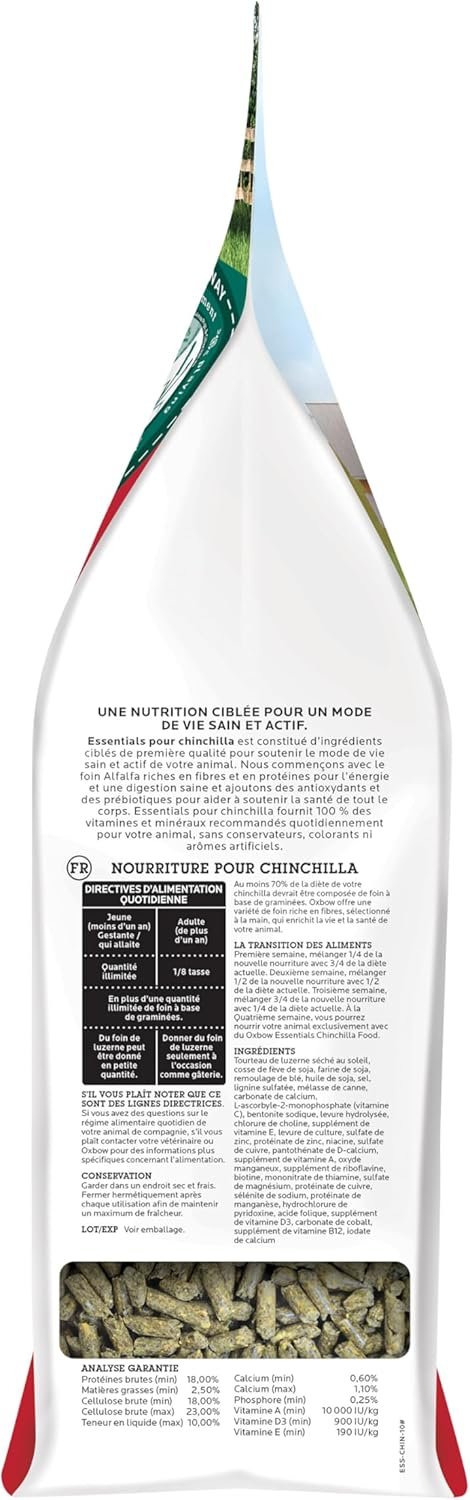 Oxbow Essentials Chinchilla Food is a veterinarian-recommended, nutritionally balanced pellet formula designed to meet the specific dietary needs of adult chinchillas. This food supports healthy digestion, dental health, and overall vitality, making it an ideal choice for chinchilla owners.