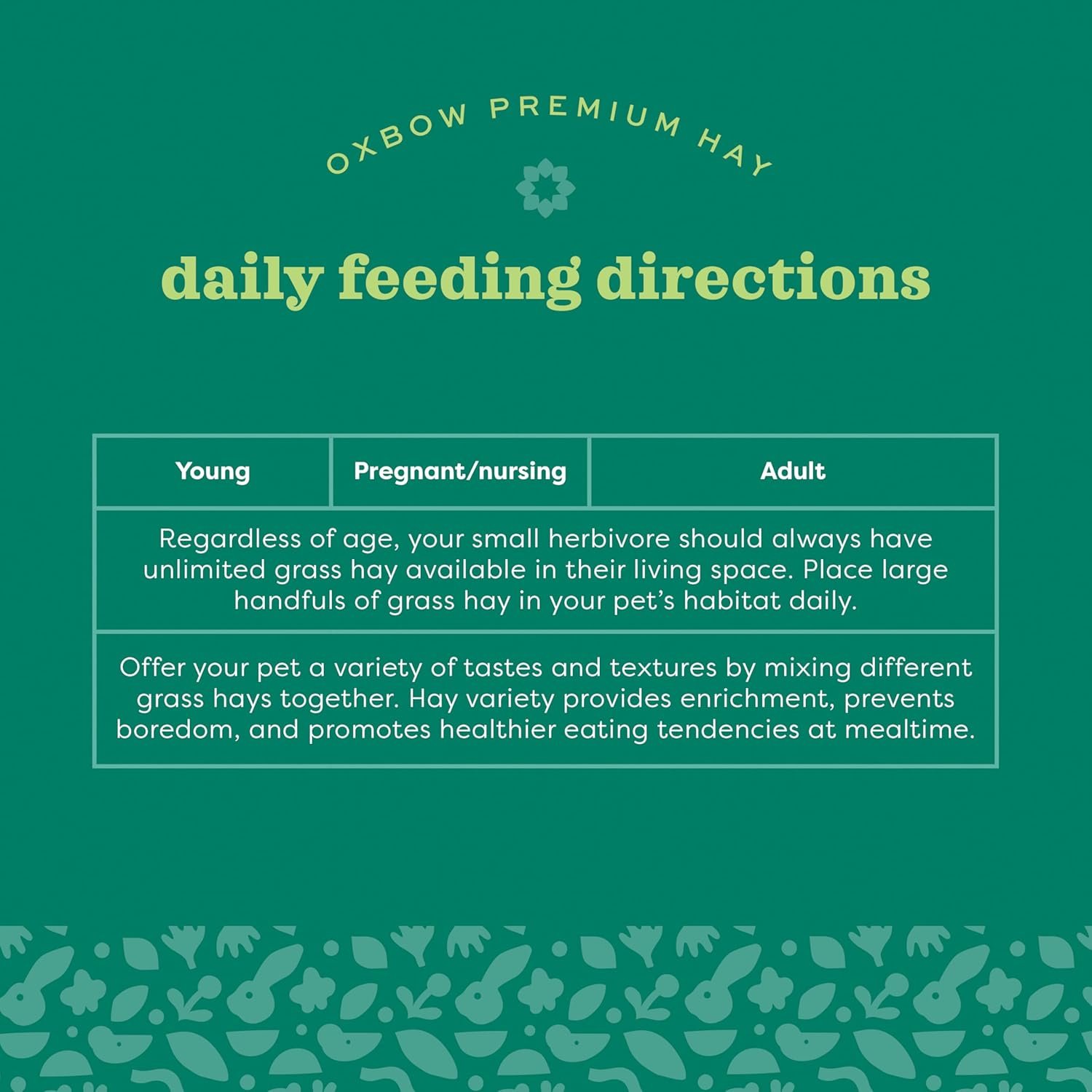 Oxbow Animal Health Orchard Grass Hay is a premium, all-natural grass hay specifically cultivated to meet the dietary needs of small herbivores like rabbits, guinea pigs, chinchillas, hamsters, gerbils, and other small pets. Grown in nutrient-rich soil and harvested at peak maturity, this hay provides an aromatic, sweet-smelling, and soft texture that encourages consistent feeding and supports digestive health.