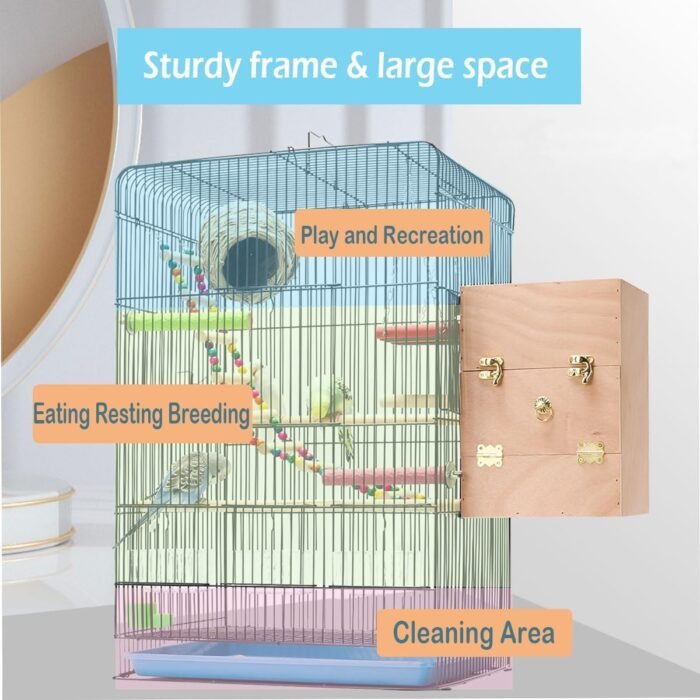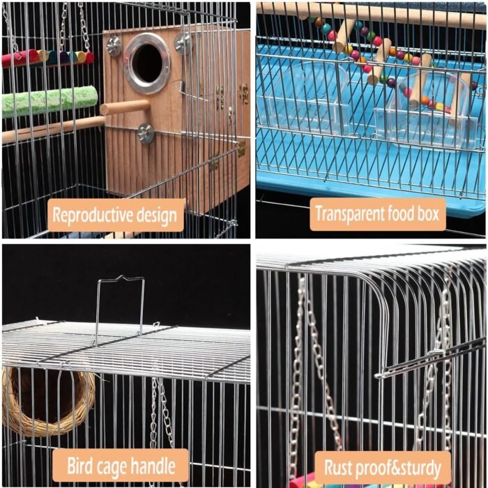 The bird cage is made of high-quality steel wire and coated with anti-rust hammer paint, making it durable and waterproof. The cage features a large door with a pull-up design to prevent your birds from opening it, and spring-loaded doors on both sides to hold breeding boxes.
