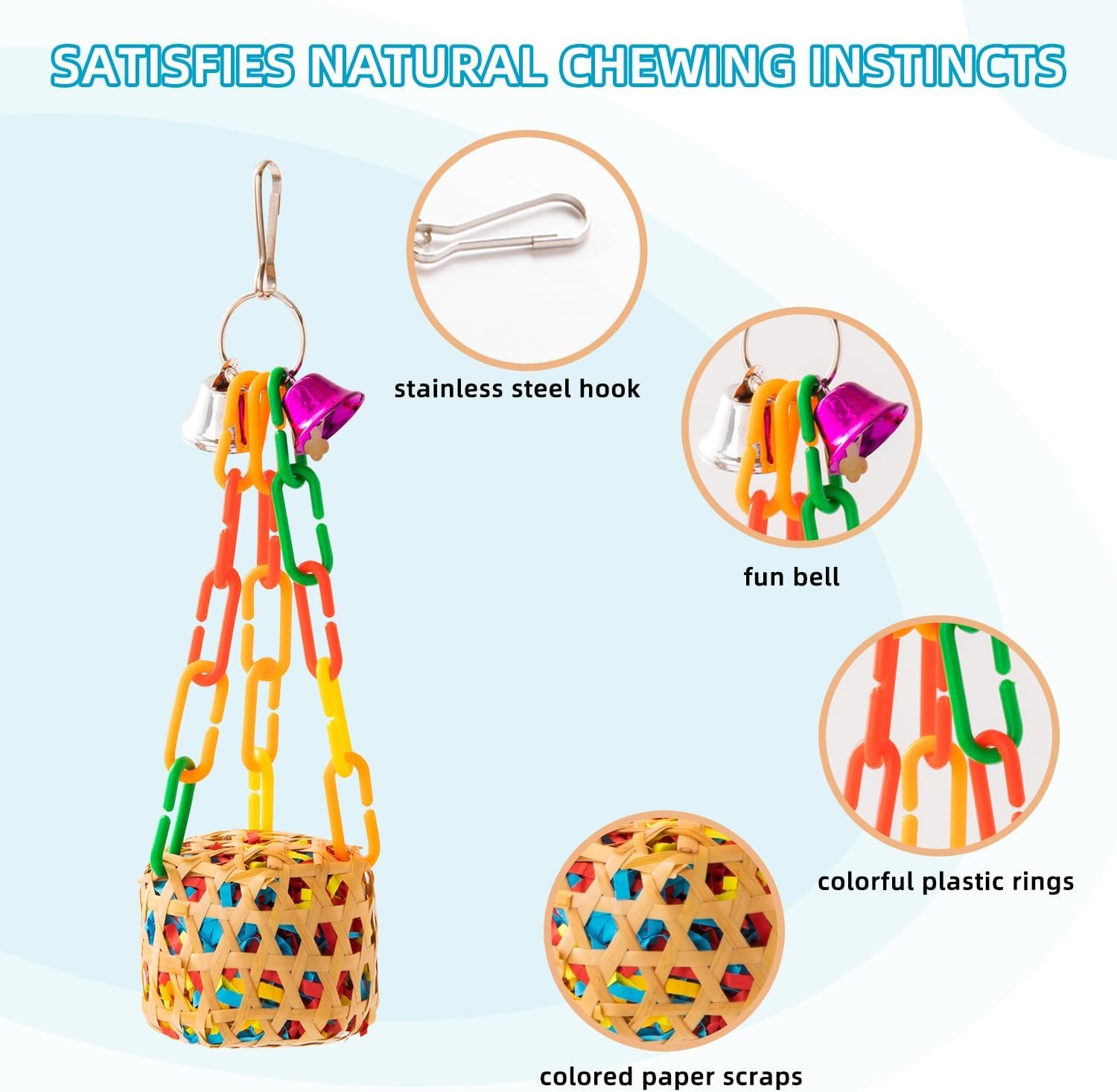 - Each toy has a hanging hook for easy installation in the bird cage or play area