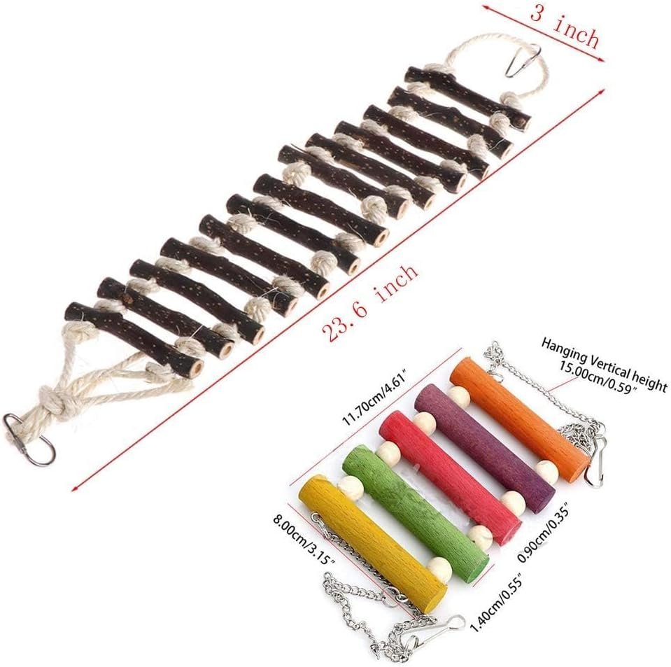 So I wanted to give this all 5 stars. It was cute, I made a little bridge for my birds to hang out on. They are so cute. But little bluey has been obsessively picking it apart since day one of it being in the cage. First the log was chewed off and now he’s picking at the rope. Just hoping there is no chemicals (especially that are harmful to the birds) are in there or were used to make this ladder. So yea, overall my bird may be a little mental but they love it. I think this weird obsession bluey has with this ladder entertains birb. (Yellow bird). Definitely worth the money for small maybe even medium birds. (For the length I got)