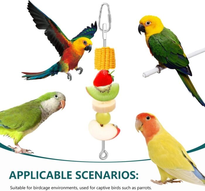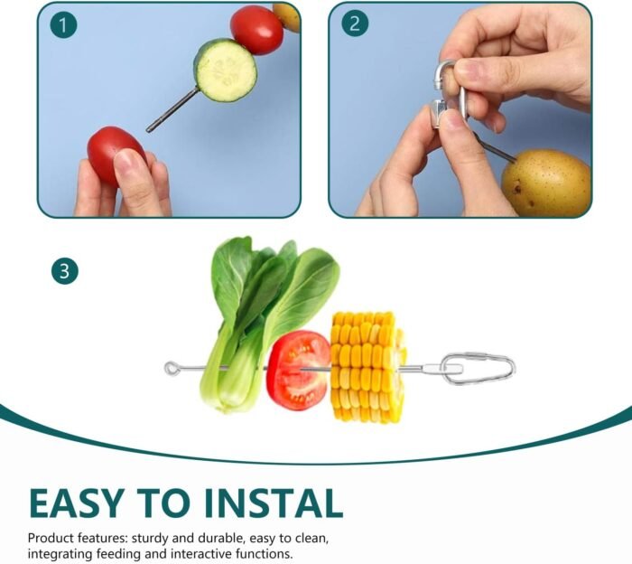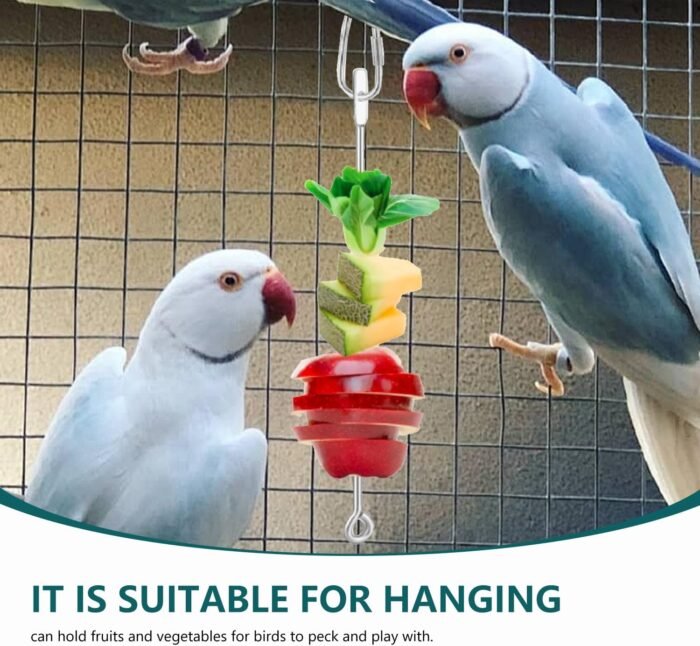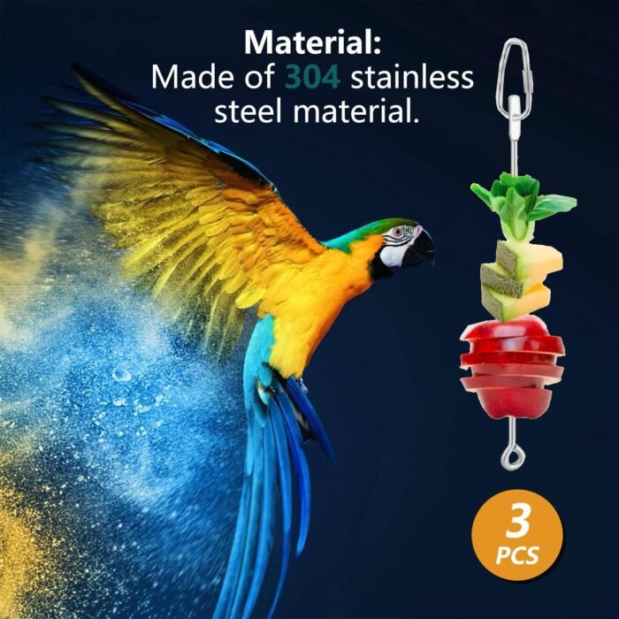 I didnât think a bird food holder could be this impressive â but this 3-piece stainless steel parrot feeding set totally changed how I feed my birds! The quality is excellent â durable, rust-resistant stainless steel that feels sturdy and safe. No sharp edges or flimsy parts, which is super important for my curious little parrot.The twisted suspension design is clever and keeps fruits and veggies securely in place while giving my bird a fun and interactive way to snack. The fruit clip and veggie stick hold everything from apple slices to leafy greens without slipping, and I love that it doubles as a feeding toy â it keeps my parrot entertained and mentally stimulated while he eats!The anti-knock and detachable design makes cleaning a breeze and prevents messy spills all over the cage. Plus, the mounting hardware is simple to use and holds tightly â no wobbling or falling off.Honestly, this is one of the most functional and fun bird accessories Iâve purchased. If youâve got parrots or other birds that love fresh food and enrichment, this is a must-have. Highly recommend!